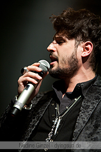 The first model appeared, imitating the late King of Pop and presenting jewellery of the label “Elfcraft”. When OOMPH! played another hit of them, ‘Gott ist ein Popstar’, a total of six models dressed in black were standing immobile at the stage, whereas some boys were adorning them bit by bit with lots of silver necklaces. After this song, Dero quoted Barack Obama “Yes we can” and OOMPH! played their song ‘Revolution’, which calls people to protest against injustice. Dero indented to animate the audience crying out “Berlin, Berlin”, but in vain. Only when he called the poverty of children in Germany a “shame”, people woke up of their indifference and acclaimed the song ‘Sandmann’ and also the next song ‘Fieber’.