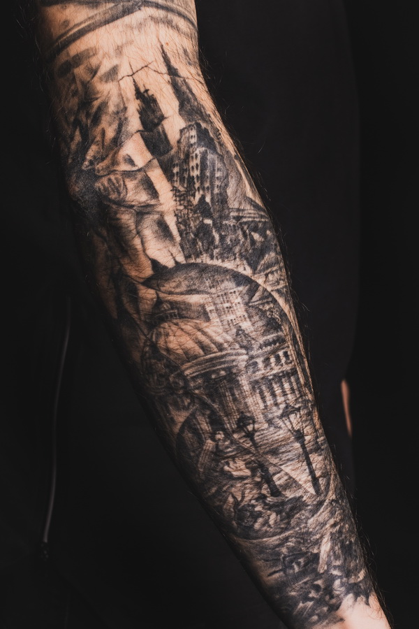Pavel S.: Apart from the first small tattoo on my leg, I have my whole right arm tattooed: “sleeve” from shoulder to wrist. 12 sessions, each from 4 to 6 hours. I started thinking about global work more than 10 years ago. You know how it happens: you start to play music, you play Rock, you wear chains and leather jacket, and like any novice musician full of Rock’n’Roll and protest, of course, you dream of a cool tattoo! Fortunately, later everything changed… I’m still studying music now, but the tattoo, in my understanding has grown into art, symbolism, and self-expression. Thinking about the idea for many years, I came to the first serious session with the confidence at 30. A conscious choice as a gift for the first conscious anniversary. At that time, I was already aware of 99% of the subject matter that the artist applied it to my skin.
