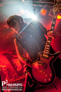 The title was followed by the great ‘Blut Royale’, one of the most known songs of COMBICHRIST. Meanwhile, the Markthalle was pretty filled with people and a little dancefloor was formed in the middle of the audience room. Drummer Joe Letz could also make his own solo show with his performance. Sometimes drumsticks fly across the whole stage and almost hit keyboarder Z Marr on the head. Two or three times, also the tom-tom drums found its way to the front edge of the stage. At the end of the show, only half of the drum set stood at its old place. COMBICHRIST showed an inexhaustible energy in their performance. They danced and jumped by ‘Throat Full of Glass’ or ‘Never Surrender’ across the stage without any longer breaks. All in all, the songs sounded live even better than the recorded versions and you almost had to have fear, that you won't like the songs anymore, and then there are not played live at the moment. With ‘Shut Up and Swallow’, COMBICHRIST had the full support of the fans with the lyrics and at ‘Electrohead’ the energy seemed to get more powerful than before. After ‘Love is a Razorblade’, the main part of the concert was first over.