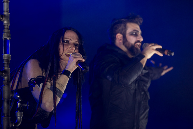 Somewhat about 8pm the hall lights turn off and the masters voice himself sounds out loud over the speakers. After the short and spoken intro, SPIELBANN make short work and open rocking with ‘Auferstehung’, ‘Feuerteufel’ and ‘Monster, Monster’. To calm down, Nic Frost walks towards the microphone, holding a letter in her hand and looking longingly afar. ‘Lebewohl’ first starts with soft drums and guitars and forms the first quiet song of the set. But after this, the band performs with familiar powerful sound, so the audience got no real time to catch a breath. The music tempts too much for dancing and jumping. After ‘In alle Ewigkeit’, the band thanks ASP and the fans gushingly and leaves happy and sweaty the spotlight.