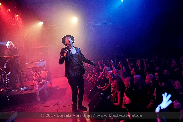 Three years ago I had seen WILLIAM CONTROL for the first time at the Pluswelt Festival in Krefeld. And though the choice for this band seemed to be a bit strange among all the more EBM / Aggrotech / Industrial bands on that day it quickly emerged that WILLIAM CONTROL quickly won the audience over. After the opening act now the music sped up distinctly. Wil was accompanied by two keyboarder with one also singing the backing vocals and a drummer. Wil, a mixture of a tattooed Rockabilly and elegantly dressed dandy definitely is eye candy. And to top it all he has a great stage presence with an air of being flippant and charming at the same time and also a good vocal quality. Actually you could call him a limelight hog who loves great gestures. He continuously invited the audience to interact. And the people danced and partied with the band. The keyboarder in front of the stage, who sang the backing vocals, rocked as hell, too.