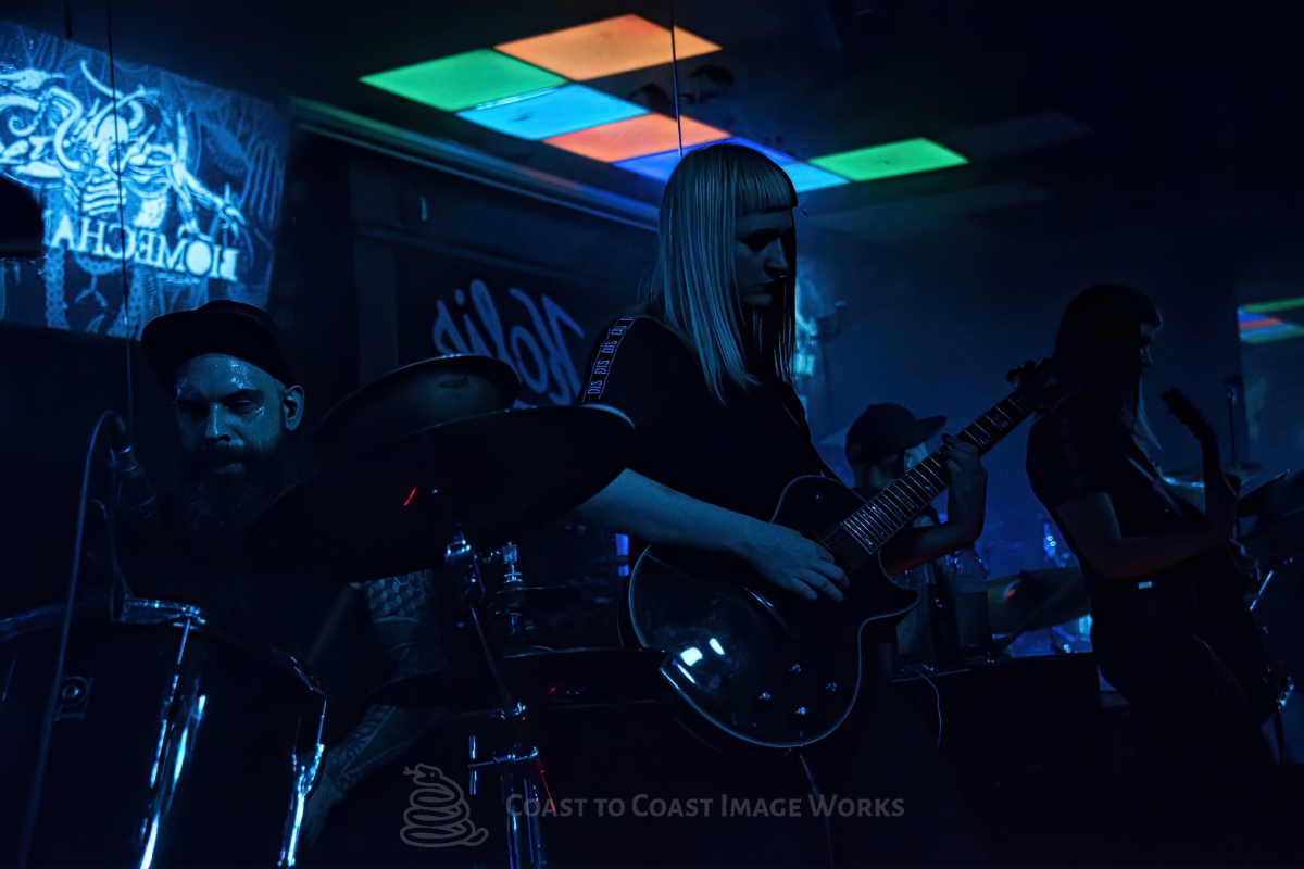 The preparation from this writer and photographer was abysmal for this trip - I had over 500 miles round trip to attend this gig and decided to pack light. I neglected to pack my favourite gig lens, and even arrived late at the venue - not good. However, I did manage to get straight to the front, and kept my place within the high-energy crowd throughout! BIOMECHANIMAL arrived on stage shortly after, the first thing I noticed was Lex, complete with guitar being helped onto the stage - she had her leg in a pot having suffered some kind of an injury - presumably a broken bone. Amazingly she managed throughout, huge kudos! The stage was very, very crowded with little room for a four-piece band to move. Having two touring bands, AESTHETIC PERFECTION and JADU’s kit on stage - along with BIOMECHANIMALS drum kit and mixing desk - meant it was very, very tight for the band to move.