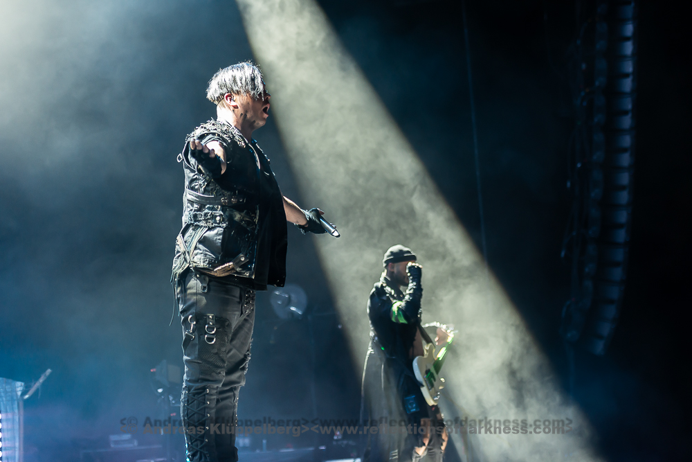 The boys of EISBRECHER didn’t even stop to cover old German songs from the Neue Deutsche Welle. In this case it was the TRIO classic ‘Anna’. EISBRECHER are something special, which you could see with the song ‘Eiszeit’. It suddenly started snowing on stage and the band appeared in fur jackets. Alex, on the other hand, was at the front with a fur hat and long coat. With two ice picks, which he hit on each other, he heated up the fans. Due to the warmth in the hall, this was not really necessary. That EISBRECHER can also play quieter sounds was shown by Alex together with Jürgen. The two entered the dark stage, where only two bar stools could be seen in the spotlight. With their acoustic guitars, they performed an old German hit song by Michael Holm. Surprisingly, the audience sang along, although they did not fit the target group of the original song in any way.