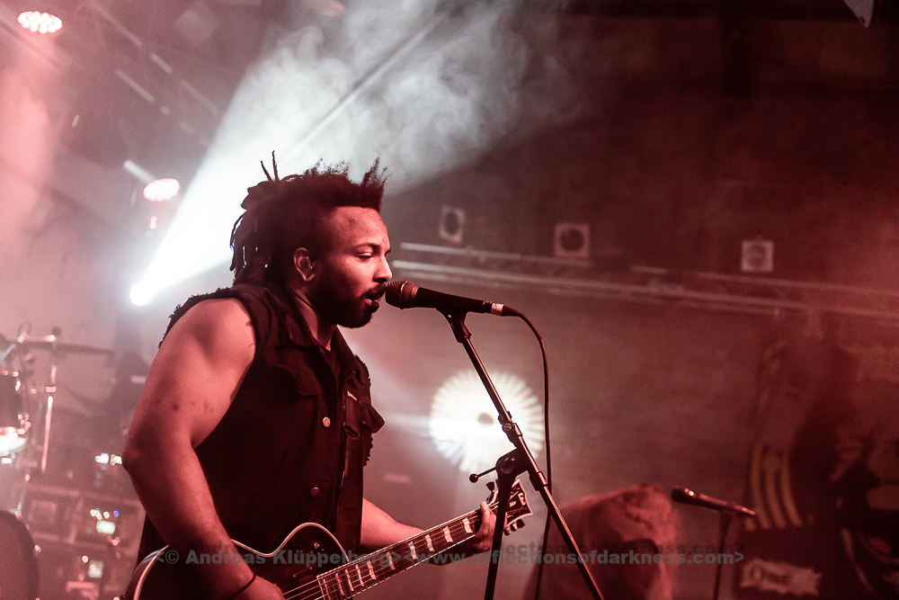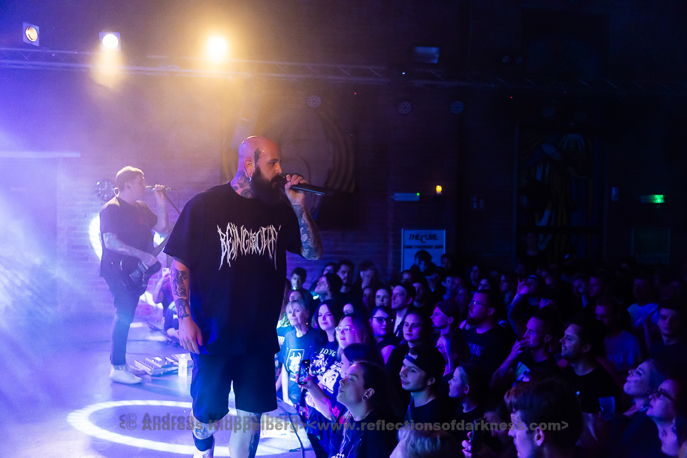 Shortly after 7:30pm, the lights went red, and OF VIRTUE entered the stage to perform their new song ‘Hypocrite’. Pretty early on it became clear that OF VIRTUE are cut from a different cloth. Frontman and chief screamer / growler Tyler and guitarist Damon worked the crowd up in perfect harmony. Watching them perform made you feel you were watching a truly cohesive band with lots of common mileage together. OF VIRTUE pulled no punches and stirred up the excitement for the main act by using all tools of the trade such as calling for circle pits, engaging in a ‘wall of death’ they were opening for and thanked everyone for coming out early to witness their gig. Singer Tyler also made it is side-job to pluck the occasional crowd-surfer from the hands of the audience, and for the final song he himself took a tour on the hands of his fans through the auditorium.