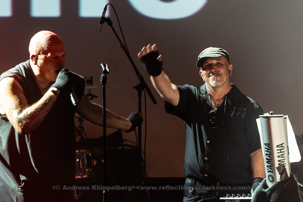 Here Jürgen pulled out the whistle and his metal sticks for the Stahlofon. He visibly had fun performing live again and hitting the pipes. So he didn’t miss the chance to climb back up on his steel microphone and thrill the fans. One already had the feeling that the walls of the Krefeld KuFa were shaking. Even though the guys waved goodbye and left the stage, it was clear that the fans demanded encores. DIE KRUPPS did not miss this and returned to the stage. Even if one could think that the boys had used up their power here, one was taught better. With ‘To the Hilt’, ‘Fatherland’ and ‘Bloodsuckers’ the band shook the walls again. While Ralf, Nils and Paul quickly left the stage after the encore, Jürgen said goodbye to almost every fan personally. He was also visibly moved by this enthusiasm of his fans.