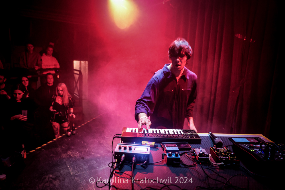 I first encountered the BUZZ KULL project in 2022 at the Cold Hearted Festival in Dresden, and it was an unforgettable experience. Marc Dwyer’s stage presence is characterized by minimalist aesthetics; essentially, his performance consists of him dancing onstage amidst his equipment, occasionally complemented by the interplay of lighting, depending on the venue and the lighting designer’s creativity. However, the energy emanating from his music is simply electrifying. In Prague, BUZZ KULL enveloped the stage in a cascade of red lights, creating a mesmerizing atmosphere that captivated the audience, who responded enthusiastically to his performance. The music itself is a captivating blend of fast-paced beats, reminiscent of old-school electronics in some songs, while others feature a sharper, more aggressive synth sound, accompanied by distorted vocals.