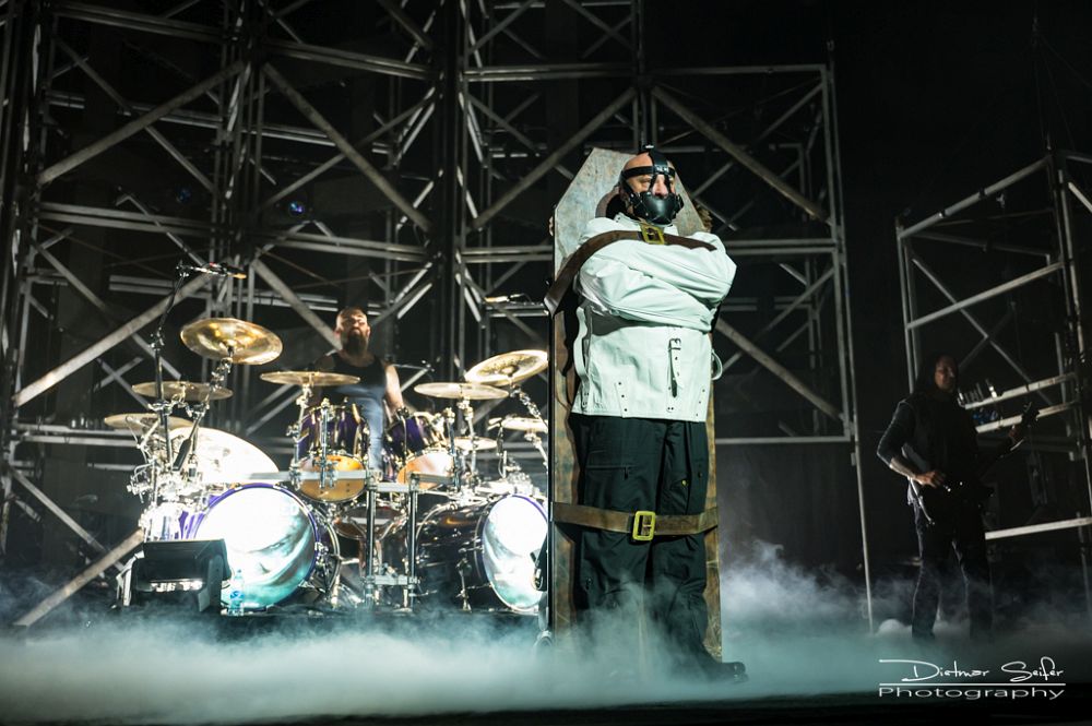 Lo and behold, DISTURBED went full theatrics mode for their entry in front of 14,000 people in the PSD Arena. At first, a video intro was projected onto a large white screen, shielding the stage. Then, this screen became semi-transparent, and was lifted slowly, while a fully mummified David Draiman was wheeled onto the stage in a cart in true Hannibal lector fashion.