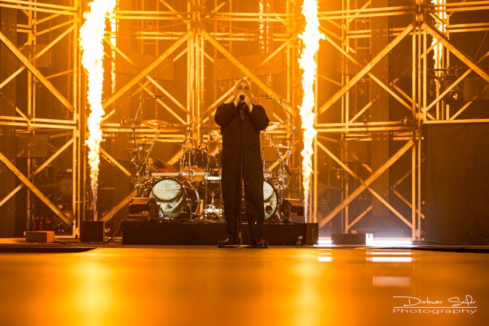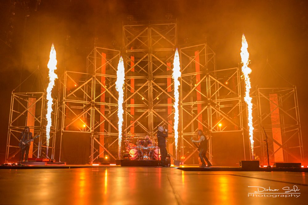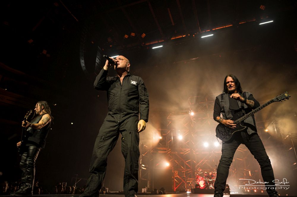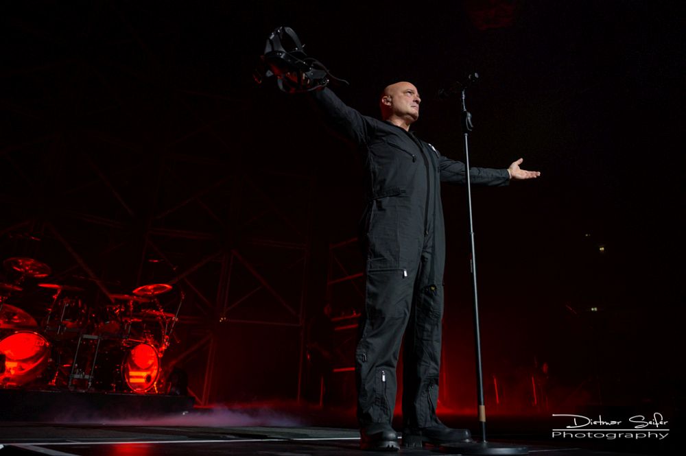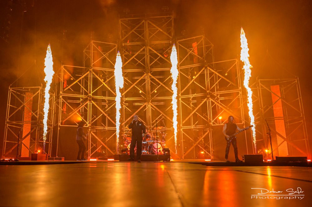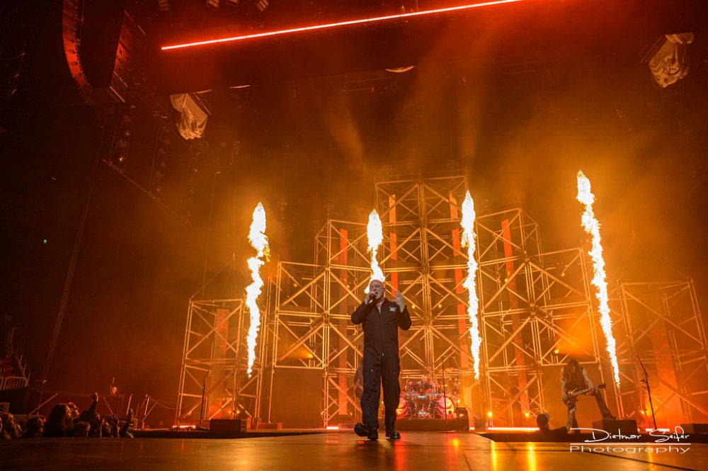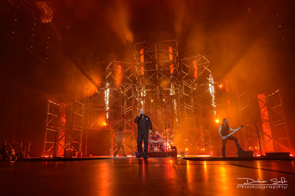 Especially during ‘Indestructible’, the amount of gasoline burned would make each member of RAMMSTEIN blush. But also, in this section DISTURBED demonstrated that they work in lower gear, too. For the SIMON & GARFUNKEL cover ‘The Sound of Silence’, the curtain in front of the stage came down again, serving as a projection surface for the interior of a cathedral with burning chandeliers. Also, a large piano appeared on the tip of the catwalk, where guitarist Dan Donegan showed his skills.