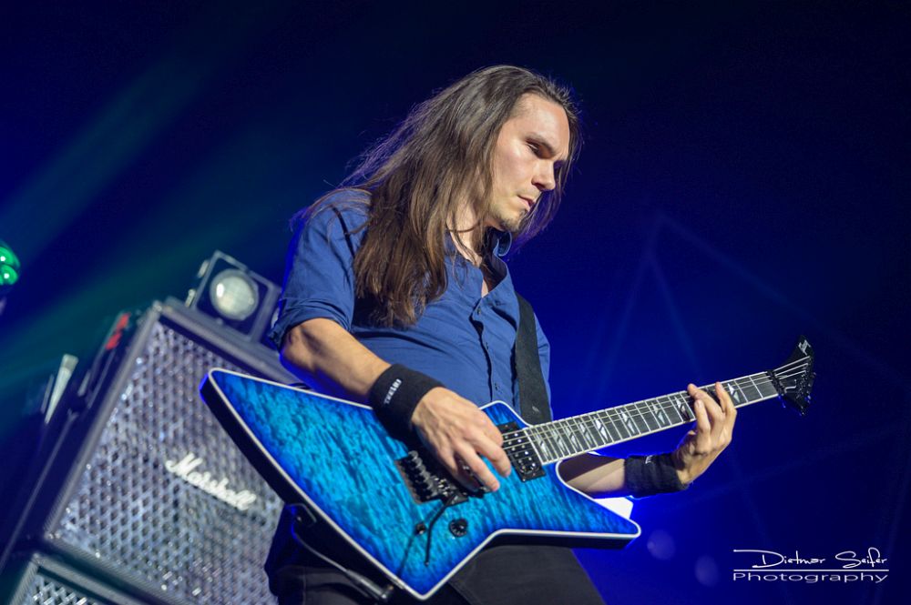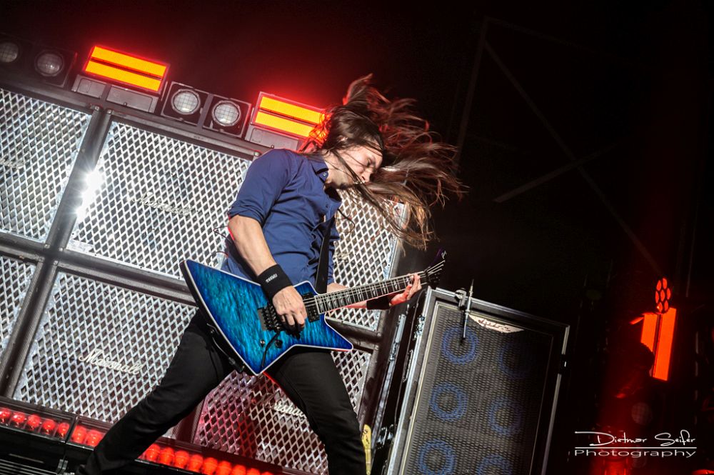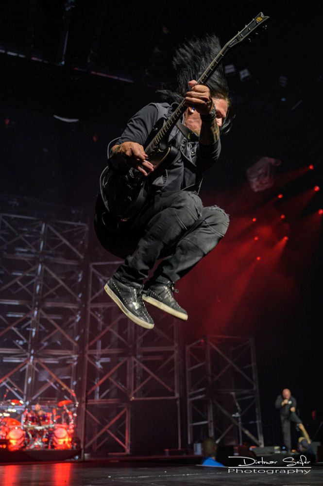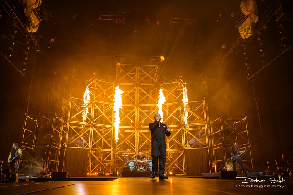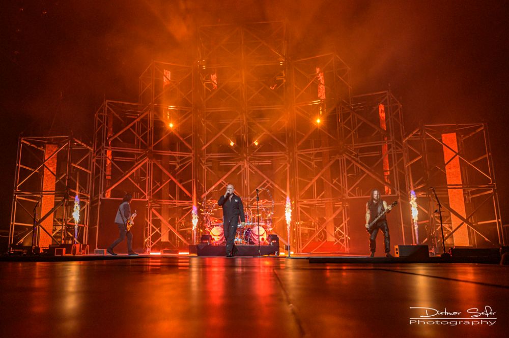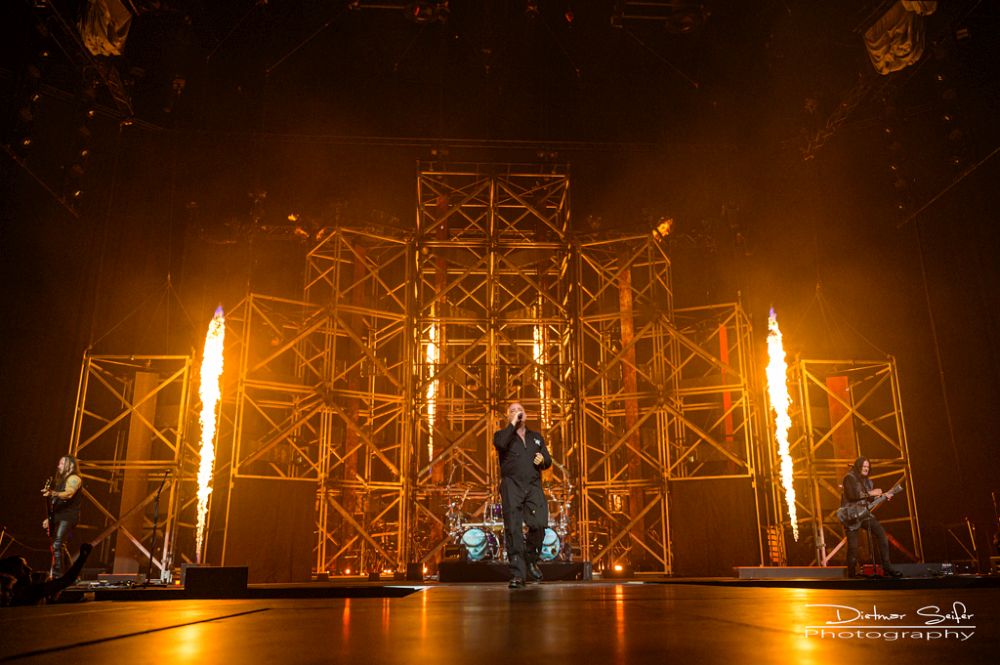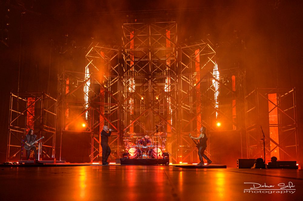 Especially during ‘Indestructible’, the amount of gasoline burned would make each member of RAMMSTEIN blush. But also, in this section DISTURBED demonstrated that they work in lower gear, too. For the SIMON & GARFUNKEL cover ‘The Sound of Silence’, the curtain in front of the stage came down again, serving as a projection surface for the interior of a cathedral with burning chandeliers. Also, a large piano appeared on the tip of the catwalk, where guitarist Dan Donegan showed his skills.