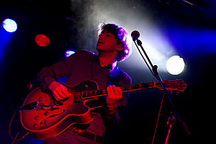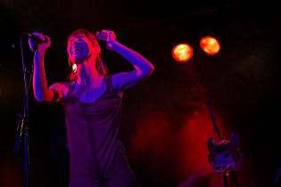According to the announcement, CHAPEAU CLAQUE went on stage at half past 9 pm. There wasn’t any supporting act and the band started performing without further ado. Besides the obligatory five band members, a female cellist was on board too. At first, the small crowd of listeners was pretty quiet and restrained, but after some songs, the people became more and more relaxed. As I read on the internet, the musical style of the formation is described by the term “electro pop” again and again. I think that this description doesn’t do them justice, as the pieces are extremely varied and often come up with chanson-influences. Looked at individually, you will find small poetic works of art such as `Reykjavik´ and `Unsere Liebe - Ein Storch´ dealing with human everyday life in a figurative manner. Sometimes gentle and fragile, sometimes powerful, the astonishingly wise German language lyrics from the pen of Maria perfectly fitted to the playful pop style that involves classical and experimental characteristics as well.