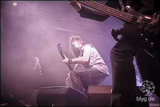 With the next song, the classical ‘I rule the ruins’ from 1987 album, the hearts of older metal heads in the audience surely became a little bit warmer. After introducing these famous hits from the WARLOCK times, DORO performed a next song ‘Celebrate’ from the new album ‘Fear No Evil’. Doro Pesch jumped down from the stage, singing before the first row of the fans, head banging with them. The songs on this evening were very good arranged to please those fans, who know the songs of WARLOCK like ‘Fight for Rock’ and ‘Metal Tango’, but also those fans, who love the softer side of DORO with ballads like ‘Love Me In Black’ and ‘Für Immer’. At the classical hit "All We Are", Doro jumped down from the stage and let the people in the audience sing the refrain with her. In the middle of the concert the song "Haunted Heart" overflowed in energetic five minutes drum solo of Johnny Dee and after that the "Haunted Heart" continued again. To the end of the concert, DORO didn't went backstage to wait for encore shouts, but asked the fans, which sings they want to hear. Some man asked her for ‘Herzblut’ from the new album, saying that he want to dedicate it to his daughter.