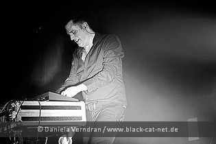 I have always said that club tours are when COVENANT live is at its best, and their show in Duisburg was bound to prove this. Over the last two or three years their German fans “only” got festival shows by COVENANT, where they often were headliners or co-headliners. The club in this steelworkers' city in the industrial heart of West Germany was quite packed, though not completely sold out, and the huge LED lighting systems on stage hinted that COVENANT indeed brought some extras for their German shows. A very long intro followed by the instrumental 'Modern Ruin' started, and to a roaring applause the three protagonists of this night entered the stage. 'Modern Ruin' nicely merged into 'Stalker', their early-day club anthem, and got people going from the start. The LED lights really looked beautiful and impressive, and in fact we were joking that we should have brought sunglasses. The glaring lights framed Eskil Simonsson like a halo while the music merged from 'Stalker' to 'Monochrome' to another single hit, 'Bullet'. This is something rather new for COVENANT live: Instead of playing separate songs they often let the tracks flow into each other, which gives the live performance some sort of DJ set feeling. Sound wizard Daniel Myer, who did not bring his big toms this time and focussed on his machines, seemed to be particularly busy with such gadgetry.