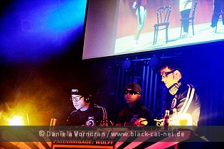We almost missed the start of the show of PATENBRIGADE:WOLFF as we were in one of the other halls of the Pulp, which is a kind of “event castle”, when the band entered the stage. The Pulp looks pretty unremarkable from the outside but inside it's designed like a mix of a medieval ballroom and Dracula's castle. Looks awesome, though a little clichéd too. Anyway, the music started, and unfortunately at a rather low volume - that's why we almost missed the start of the show! PATENBRIGADE:WOLFF started with an instrumental with the vocalist next to the keyboard racks in the middle waiting for his part. Well, he would wait a few more tracks before he finally grabbed the micro. Behind the band members there was a small video screen displaying images and movies of old East-German icons and imagery. While I have sympathies for PATENBRIGADE's driving Techno-Electro sound and their band concept I have to say that PATENBRIGADE:WOLFF's ironic take on GDR nostalgia simply doesn't work too well in front of a West German audience.