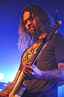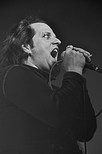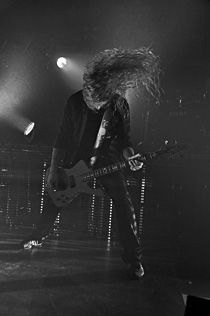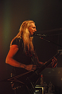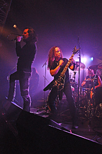 Then after another very short rebuilding break, the only non-Swedes in this evening, VICIOUS RUMORS, appeared on the stage. Actually, the band RIOT was supposed to be the third band, but they had cancelled for logistic reasons and therefore VICIOUS RUMORS got the chance to finish now the complete tour with HAMMERFALL. VICIOUS RUMORS consists currently of singer Brian Allen (whose resemblance to the Bavarian king Ludwig II might have struck to every visitor there), Geoff Thorpe (E-guitar), Stephen Goodwin (E-bass), drummer Larry Howe and, instead of Kiyoshi Morgan, the former guitarist Thaen Rasmussen. The audience liked the show of VICIOUS RUMORS very much. Brian Allen also insisted on a round crowd surfing. Their appearance offered a diverse mixture of older songs as for example 'Digital Dictator' and also quite new songs as for example 'Murderball'. After 45 minutes, the band said goodbye under blustering applause and cleared the stage for the headliner of this evening.
