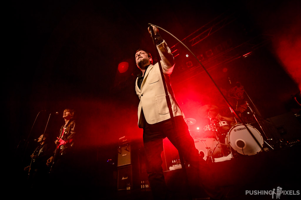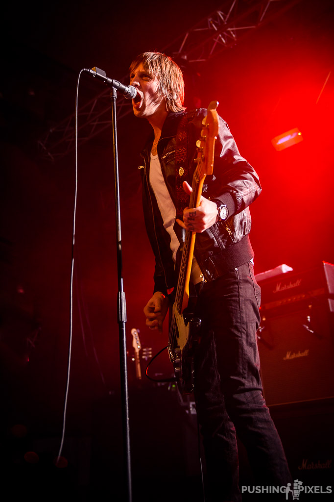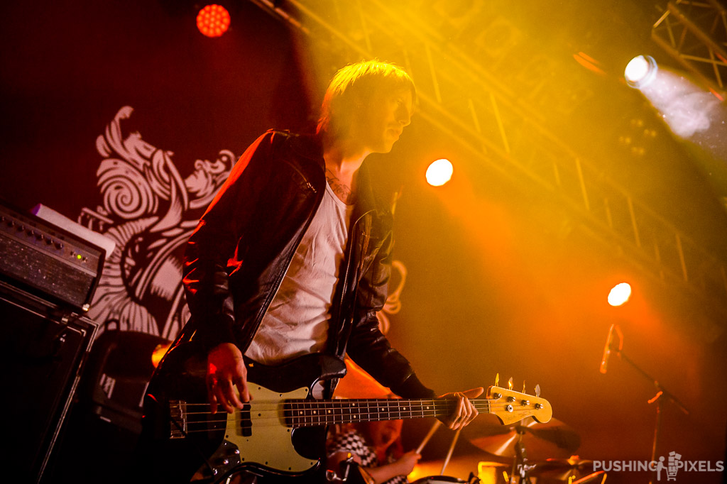 Shortly before 9pm, the speakers began blasting ‘Let the Good Times Roll’ from JD McPherson. After that the lights went out, and GLUECIFER drummer Danny Young opened up the set by picking up the rhythm of the opener ‘I got a war’, while the other band members joined him on stage. Last one to appear on stage was singer Biff Malibu, who looked like a quiz show host in his white dinner jacket. Once assembled on stage, the band put the pedal to the metal music wise, and the ensuing music sent the mosh pit into frenzy with beer cups flying through the air. A few of those landed also on stage, one even hit Biff’s microphone, but the band members took it like the pros they are, and the gig continued full throttle. The audience seemed to be more than happy for the band to return more than 14 years after their last gig in the same venue.