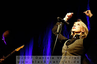 There was only little space in front of the huge curtain granted for ONETWO but they actually do not need much space. Claudia Brücken was of course in the centre, framed by Humphreys on the right behind his keyboard rack and a guest musician, on keys and guitars, on the left. ONETWO do not rely on spectacular effects, they simply present their music and have faith that this will be enough to convince the audience. Humphreys, who has the aura of an elder statesman of Pop, introduces most of the songs with a few words while Brücken smiles shyly. But when she opens her mouth to sing you are just stunned. She simply has one of the most distinctive female voices in Pop, and live on stage she’s just as great as in studio recordings. Before the show I wondered if ONETWO’s rather mellow, mid-tempo songs will work live, but they did. But Brücken and Humphreys know what people expect and threw in a few tunes from their respective musical pasts.