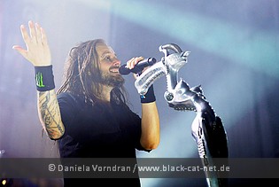 Due to a traffic jam close to the venue and then the problem to find a parking place, I arrived not on time. Apparently the band started already at 7:00, earlier than concerts normally start. Thus I had not the chance to hear and see much of them. They played a powerful mix of Nu Metal/ Metal with Rap elements. Actually they were not too bad and the guys did their best to rock the place with moderate success. But it is very hard of course to be supporting act for a band like KORN.