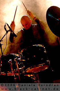 The singer, dressed with a long black coat and sunglasses, performed the vocals dedicated and powerful. The keyboard player was hitting a little drum set additional to playing his keyboards. The lightshow was straight for a support act. Highlight of the show was an instrumental with bagpipes - skirled by the singer.