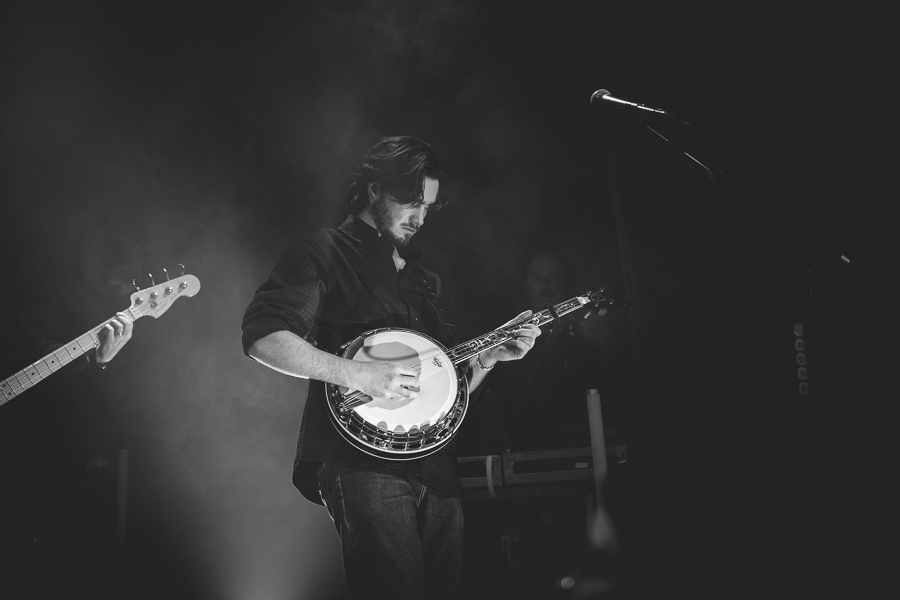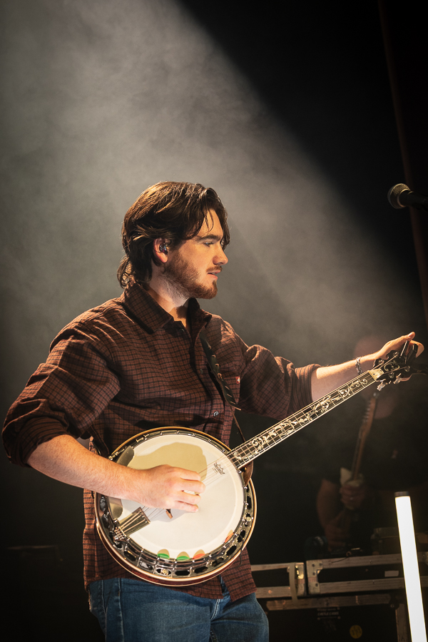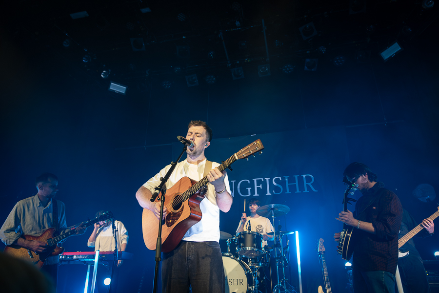 There’s no need for a break to change the stage set-up - the stage was ready for KINGFISHR when JACK CULLEN performed as the support act - yet it takes until 9 p.m. for the Irish band to take to the stage. KINGFISHR are a trio consisting of Eddie Keogh (vocals, guitar), Eoghan ‘McGoo’ McGrath (banjo) and Eoin ‘Fitz’ Fitzgibbon (guitar). On tour, however, they perform as a sextet, joined by three other young men. The three members of KINGFISHR position themselves at the front of the stage, while the three additional touring musicians gather at the back to provide support on drums, bass guitar and keyboards/guitar.
