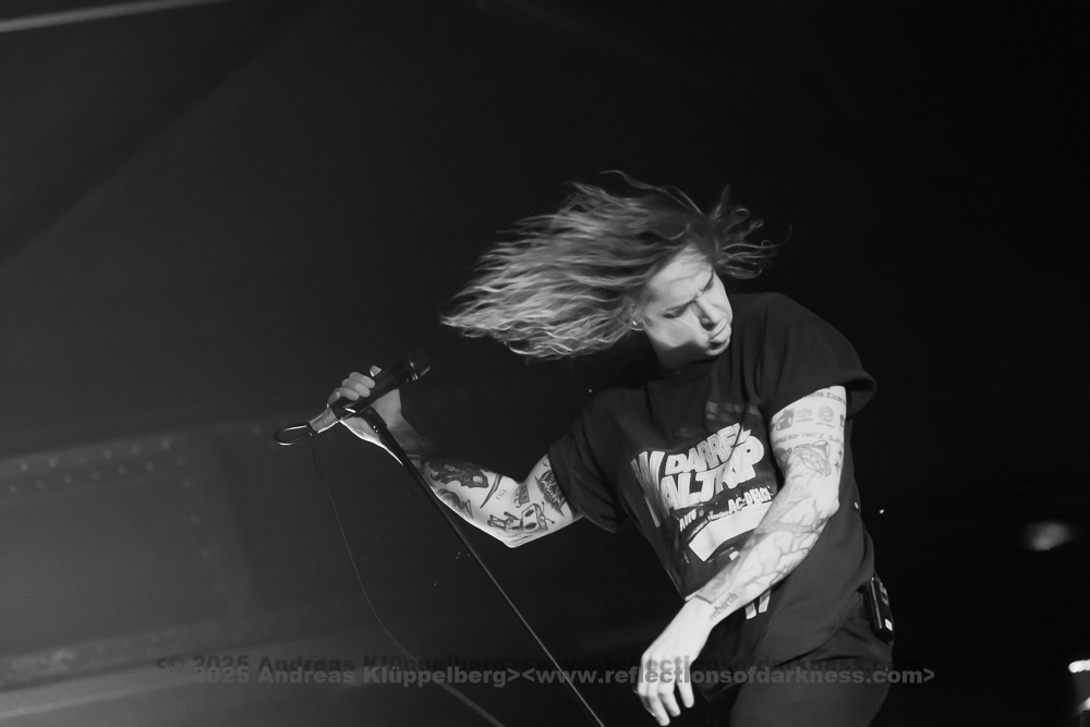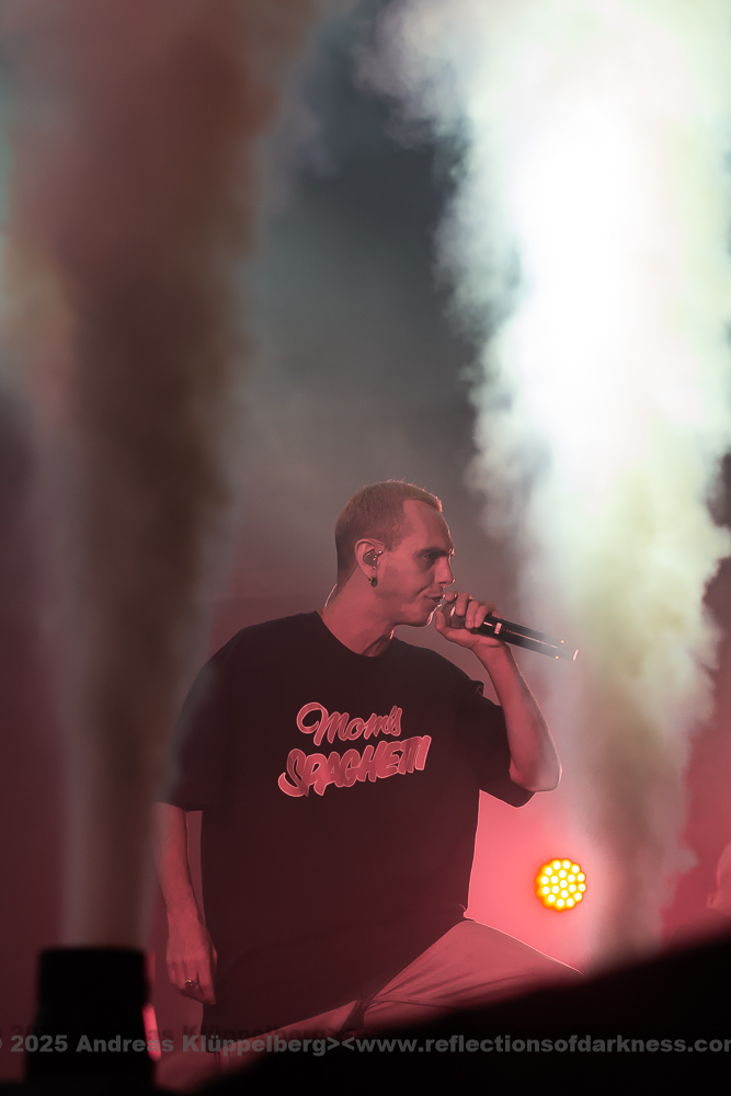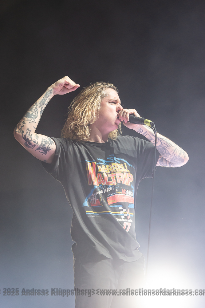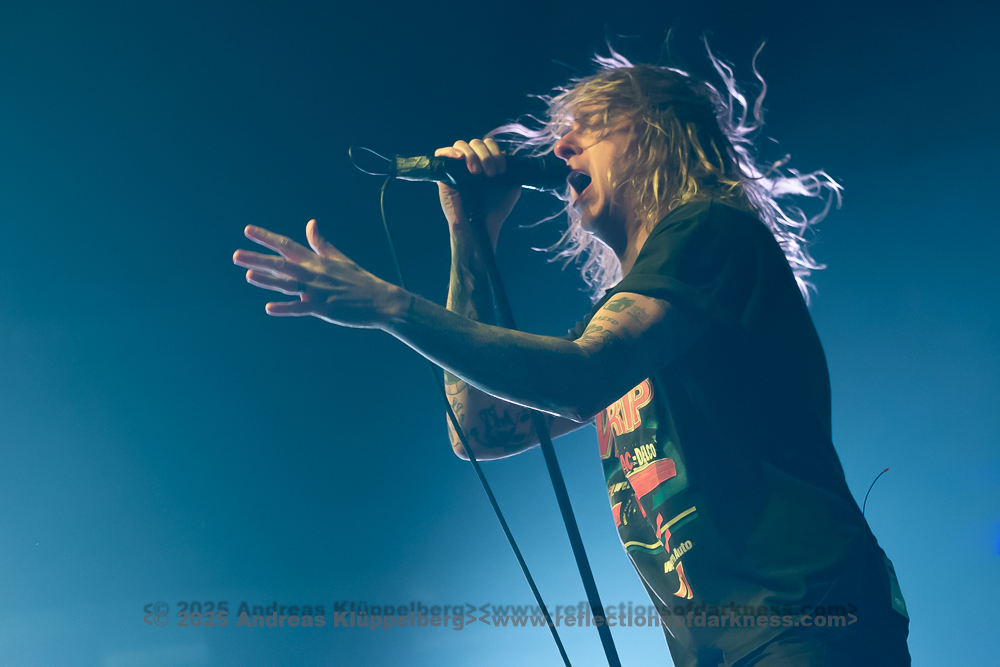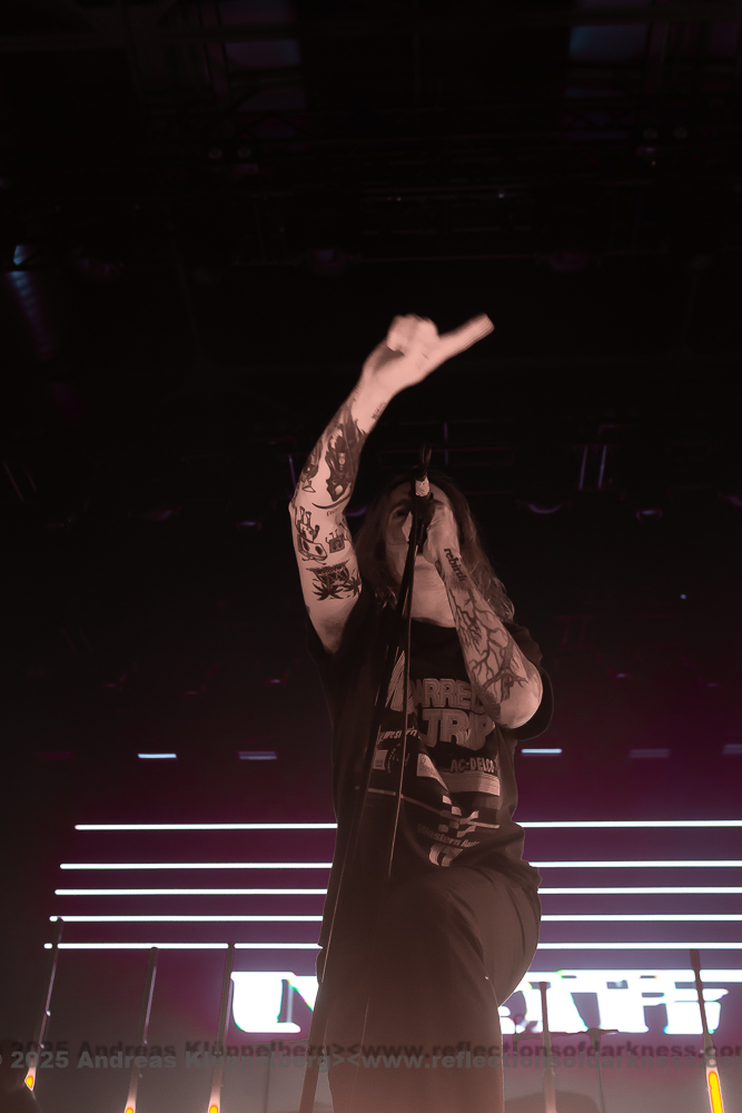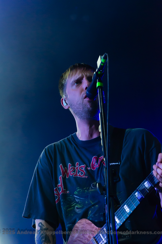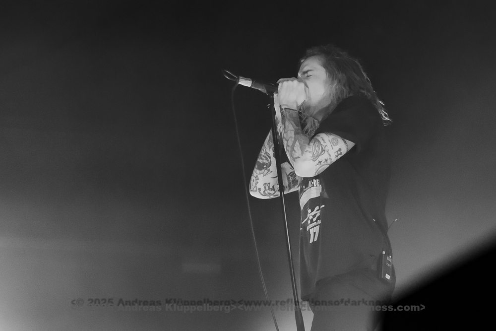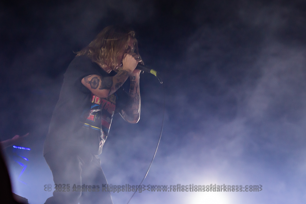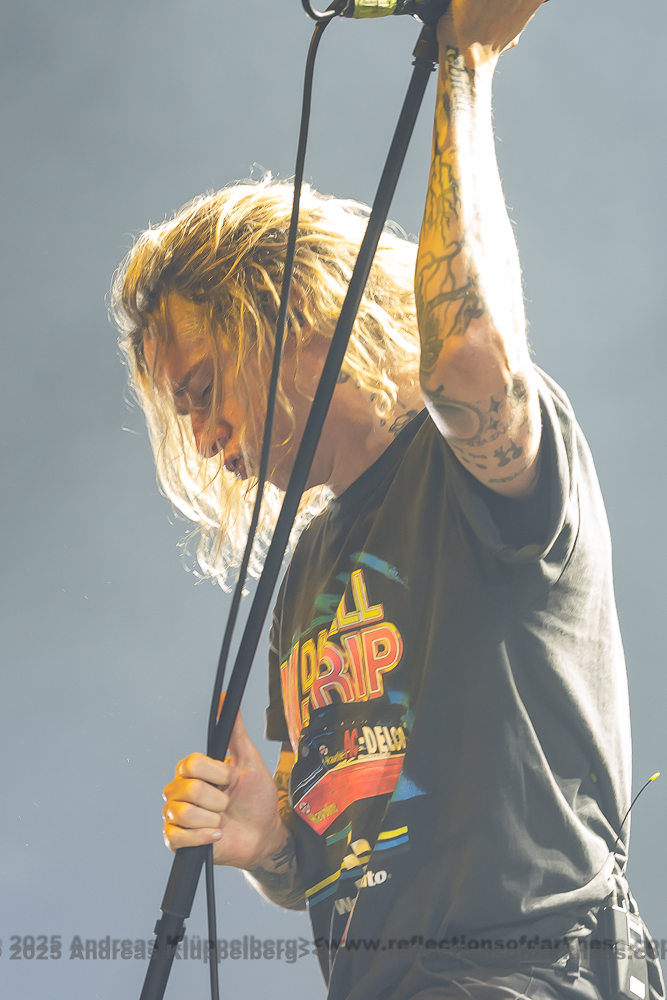 Super early at around 6pm, the band took the stage and started off with ‘Fade’, a single track from 2024. On stage, besides a ton of amps and cabinets, the band placed also two old-school tv’s, showing a lot of white noise, bizarre projections, and so lyrics fragments, which gave off a ‘Stranger Things’ vibe. In terms of their music, their screamo-oriented version of heavy music left quite a good impression. However, the more complex rhythm-patterns and DEFTONES-like soundscapes, employed by the band in their songs made the music a bit less accessible to first-time listeners. This was probably the reason, why the crowd’s enthusiasm remained a little more subdued during their gig, which ended after 30 minutes.