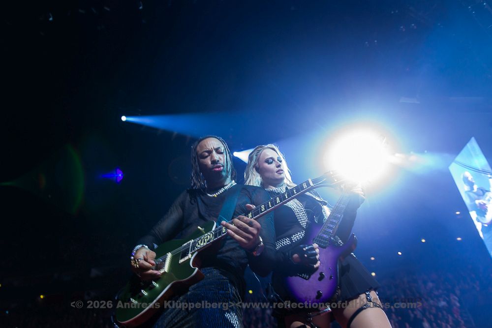 The moment MGK ascended to the stage, the Lanxess Arena erupted into a sea of pink and black. Opening with the title track of ‘Lost Americana’, the atmosphere was electric, a frenetic explosion of energy that never dipped over the two-hour set. The energy was palpable among the audience inside the sold-out arena. Someone had put in a lot of work and effort to distribute semi-transparent colour paper cuts in the different seat blocks for people to hold in front of their phone flashlight, thereby adding a colourful edge to the regular “sea of lights” scenery for the track ‘goddamn’.