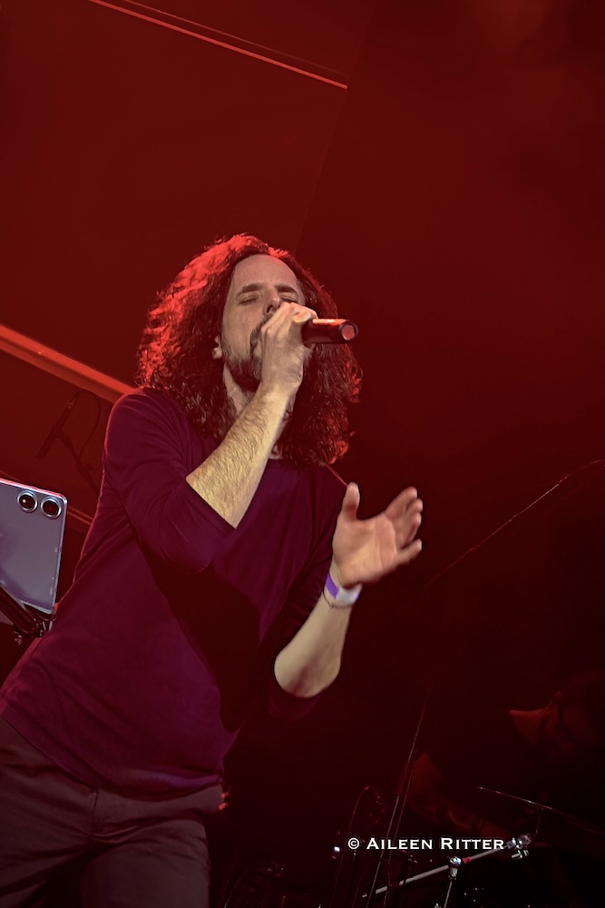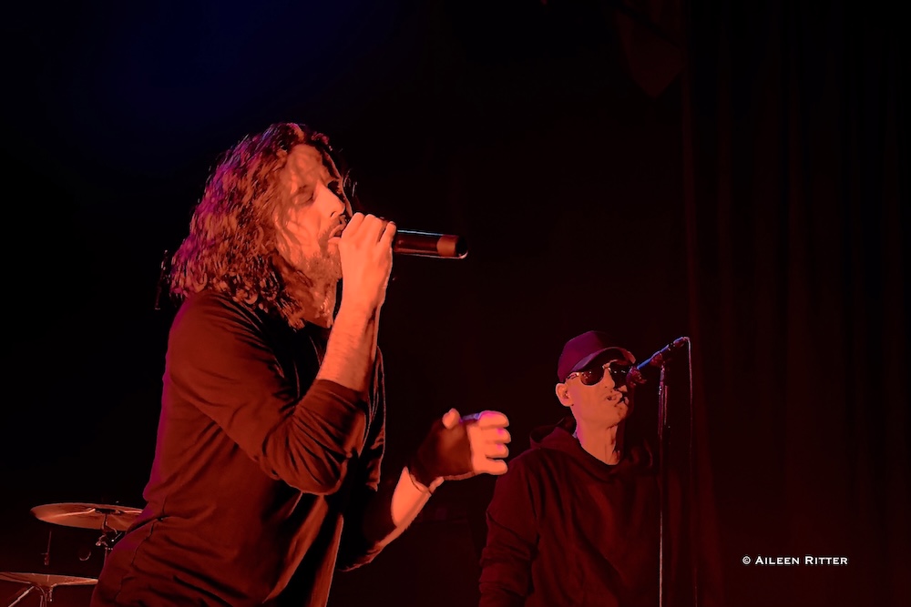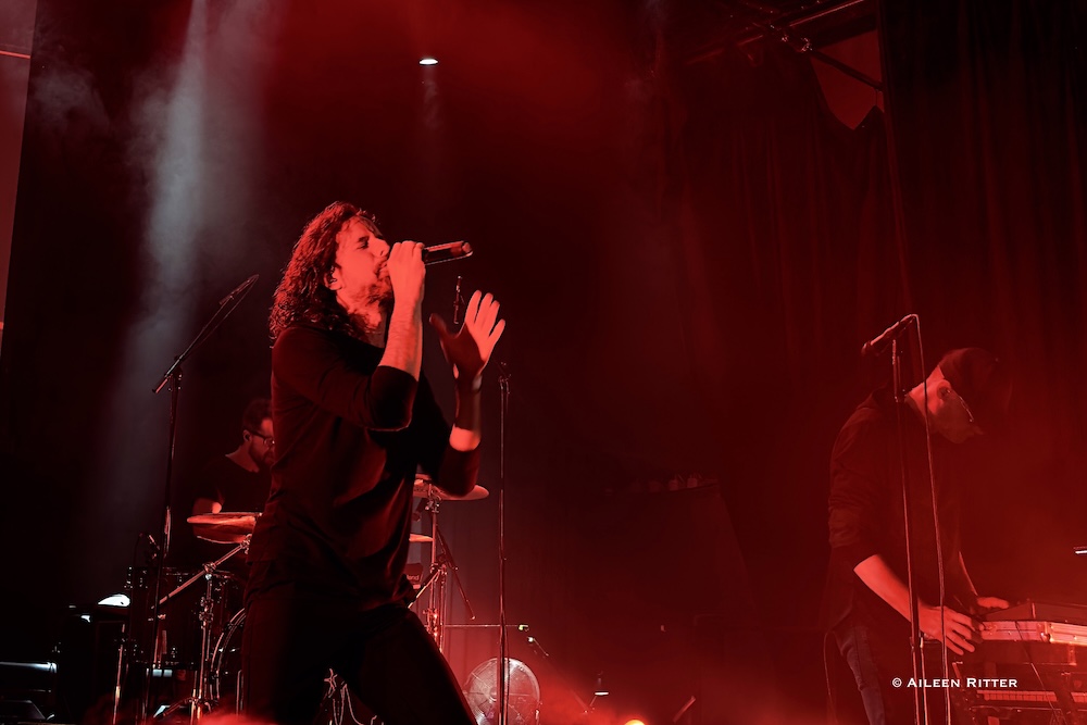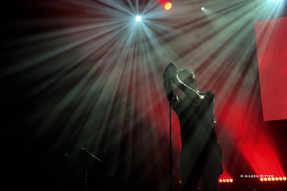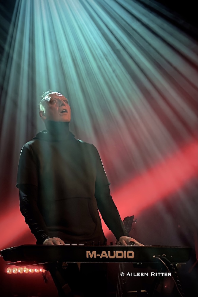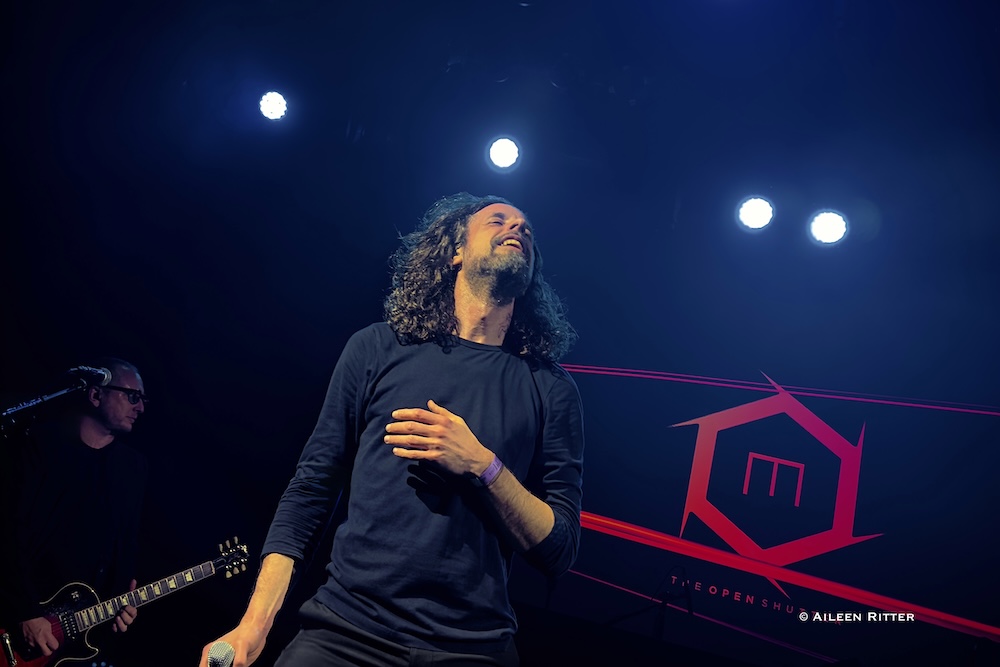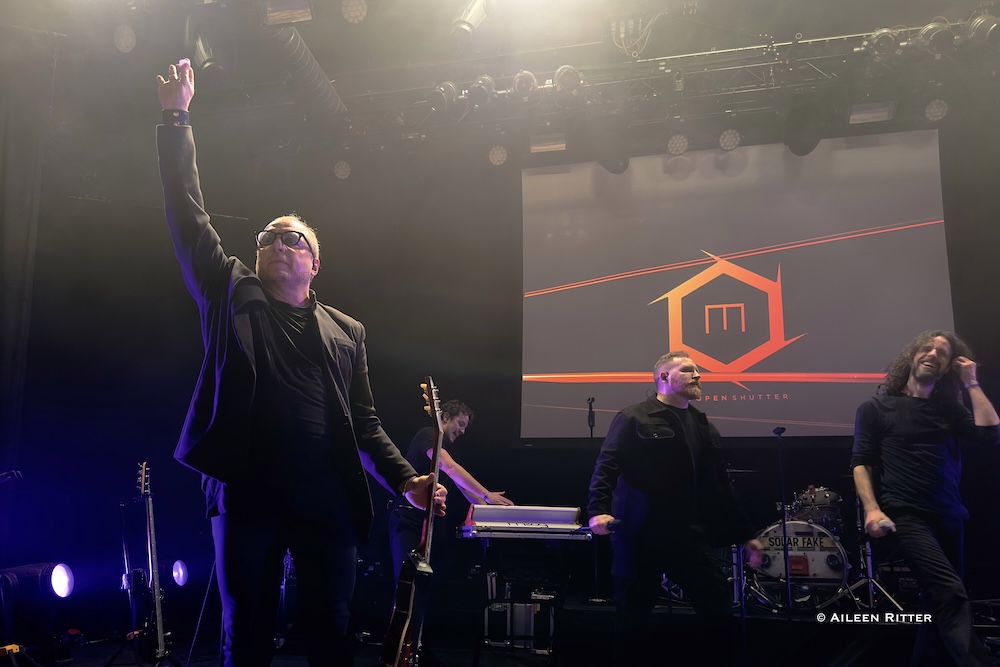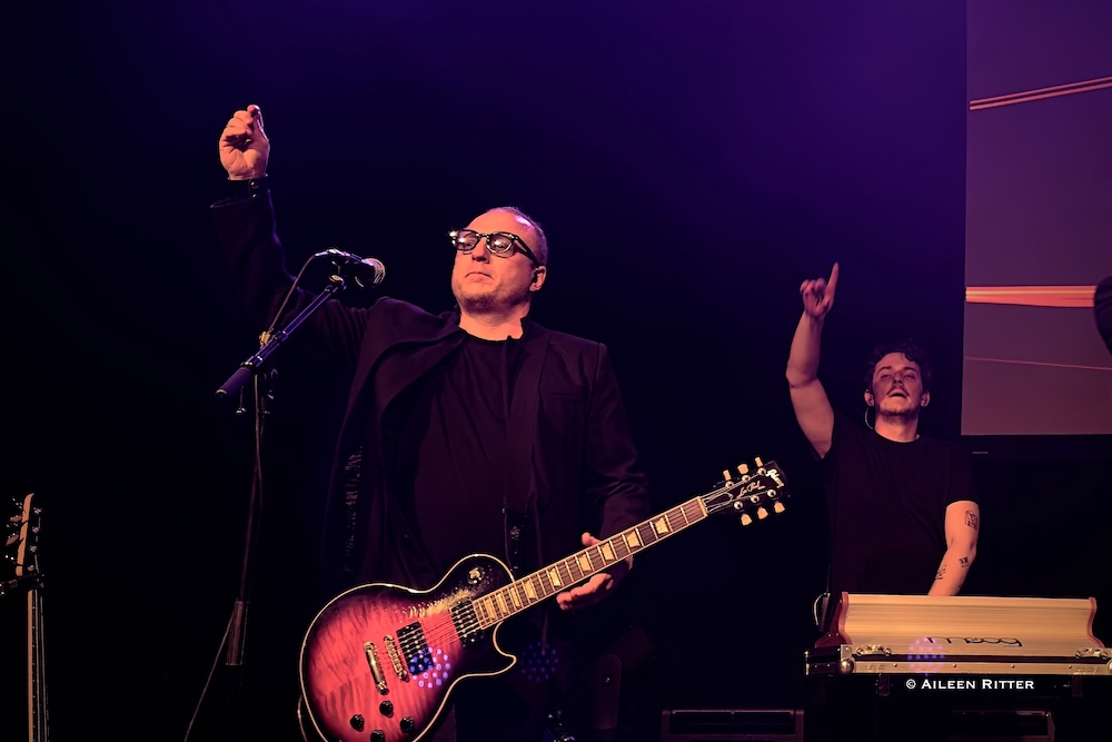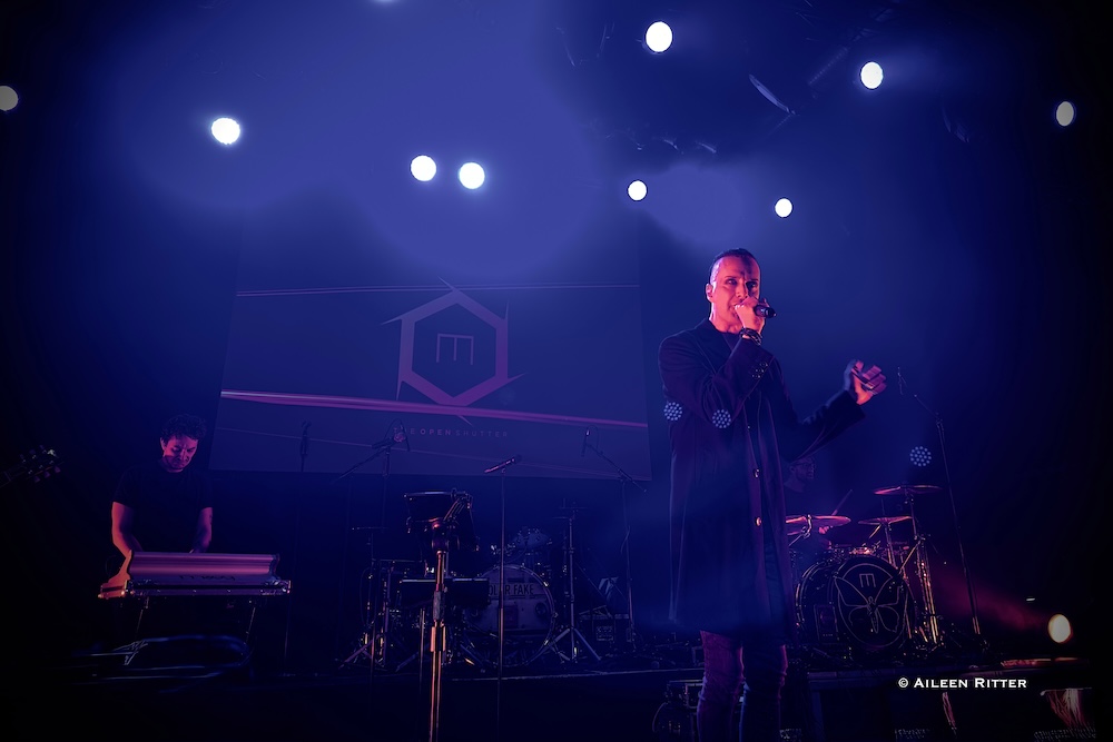 Tonight’s event, announced to begin at 8:00 p.m., started right on time. At precisely that hour, the first notes of the opener ‘Open Shutter’ sounded through the room. Due to Lennart’s absence, this time the song was performed by Andreas alongside Arc Morten at the microphones. As already in Halle, the striking red cover of ‘The Inexplicable Darkness Of Light’ album adorned the backdrop of the stage. Now the lighting technology began to move, breathing a first delicate life into the dark stage in purple.