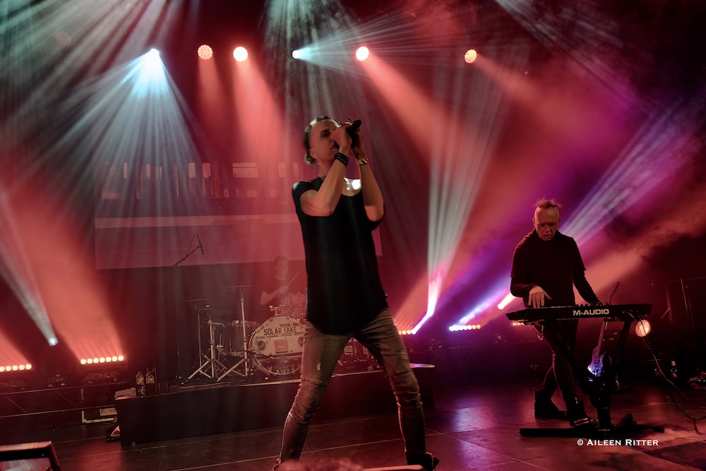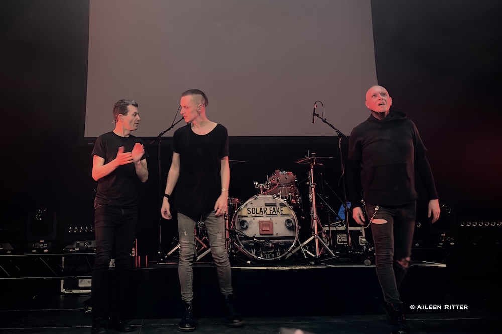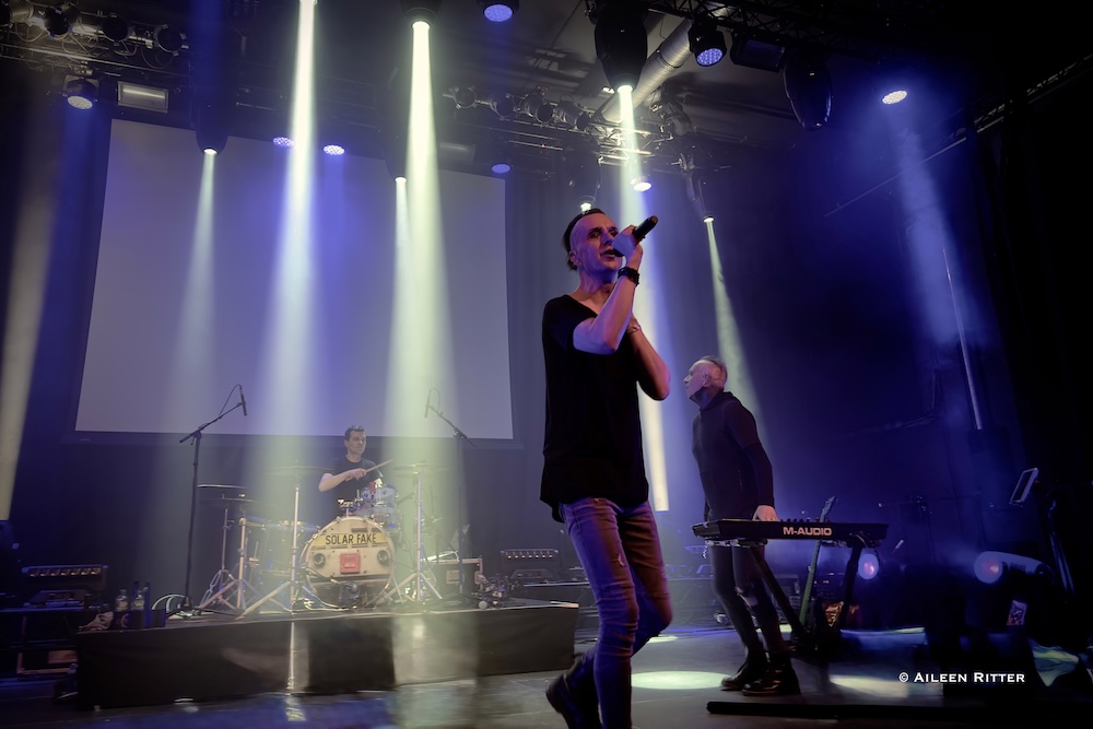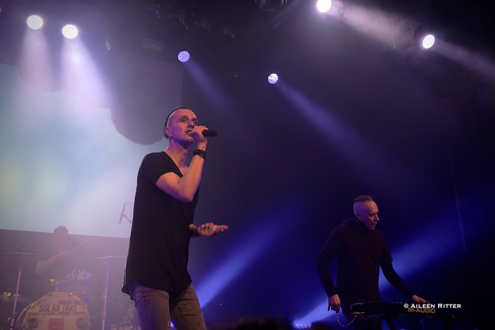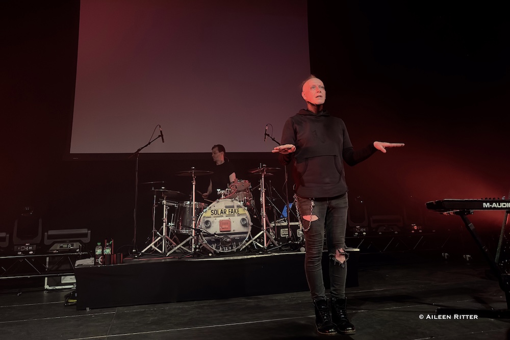 Sven then introduced ‘You Keep Breathing’, with visuals of geometric shapes, towering waves, and a storm at sea.And again and again, there is this contrast between the light, danceable musical interpretation of a SOLAR FAKE song and the heavy lyrics, which in this case deal with survival mode: being stuck, continuing to breathe, while those around remain oblivious. The audience’s enthusiastic, text-savvy response was met with generous applause and a modest, “Thank you so much” by Sven. The next song on the setlist was ‘Sick of You’. The visuals featured, among other things, a blindfolded woman, an explosion, and people moving stoically through a city, oblivious to each other.