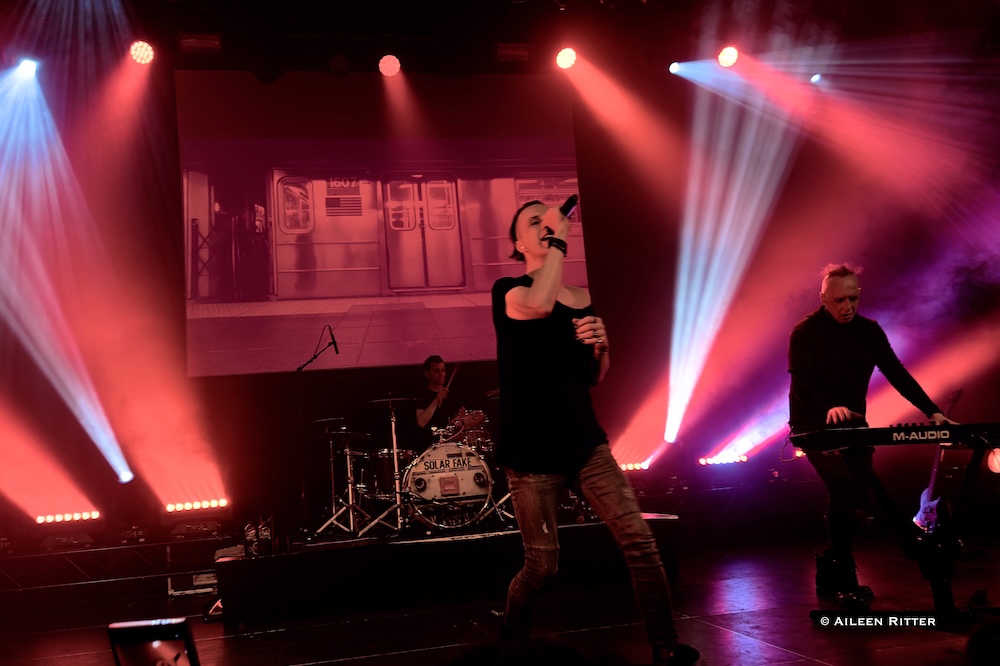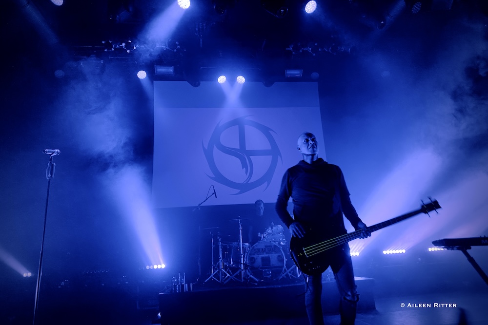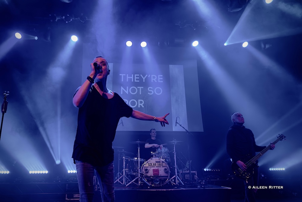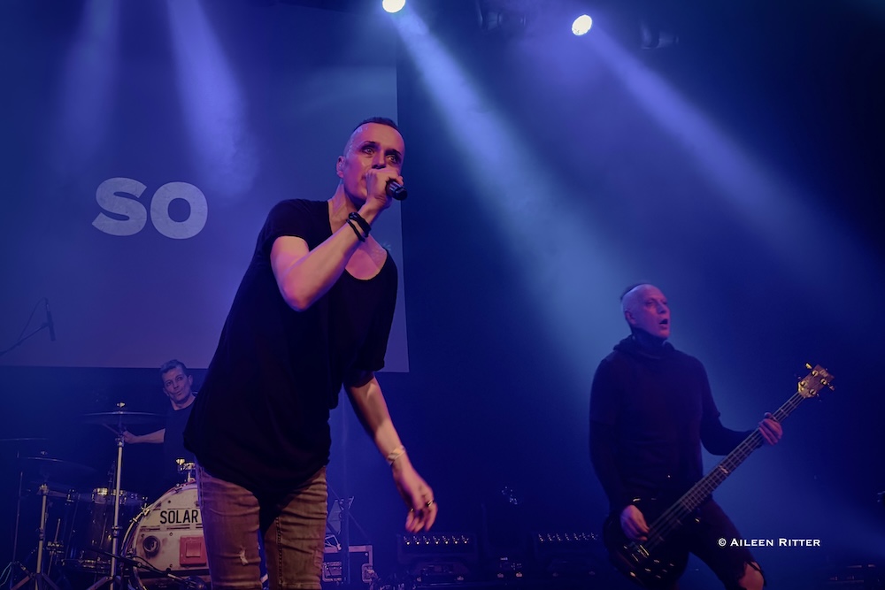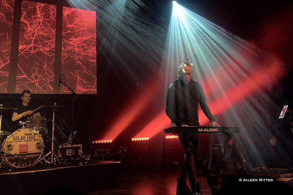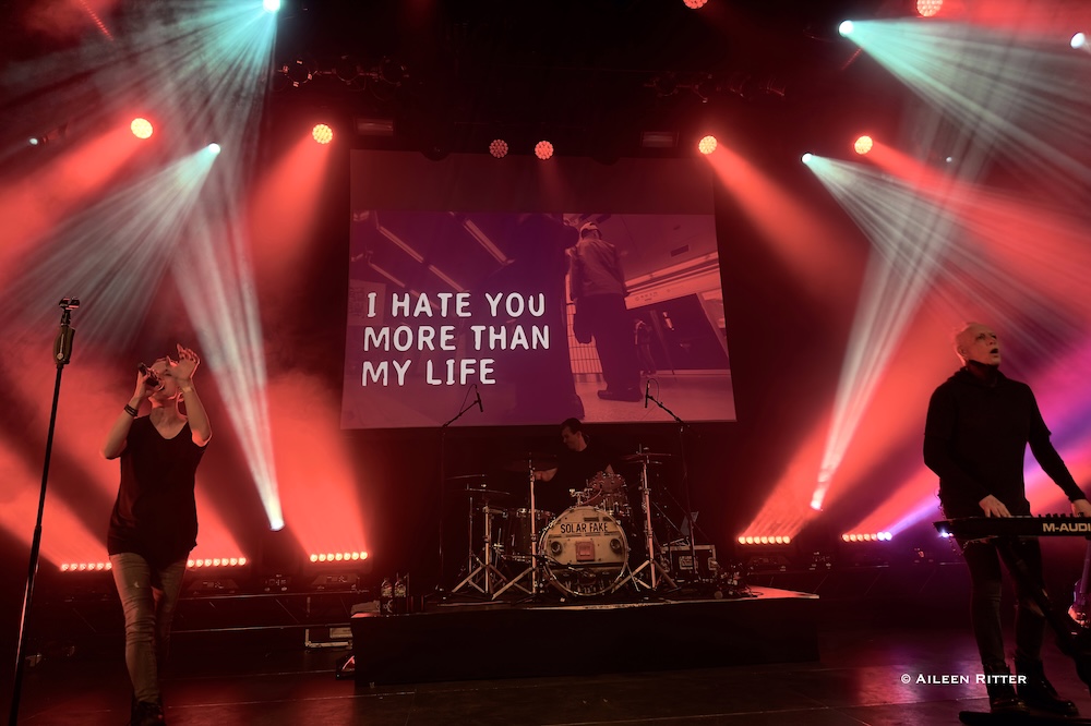 Sven then introduced ‘You Keep Breathing’, with visuals of geometric shapes, towering waves, and a storm at sea.And again and again, there is this contrast between the light, danceable musical interpretation of a SOLAR FAKE song and the heavy lyrics, which in this case deal with survival mode: being stuck, continuing to breathe, while those around remain oblivious. The audience’s enthusiastic, text-savvy response was met with generous applause and a modest, “Thank you so much” by Sven. The next song on the setlist was ‘Sick of You’. The visuals featured, among other things, a blindfolded woman, an explosion, and people moving stoically through a city, oblivious to each other.