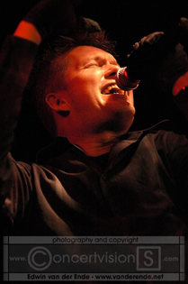 When the band kicks off both singers are still standing in the audience and slowly make their way up there when it’s time. Bryan is again wearing black gloves, not strange when he would be outside, but in here it seems to be an unclear statement. Not that it makes the show any less, Bryan doesn’t need gloves or other tricks, his excess energy makes him move all around the stage as well as in the audience. Amelie is more timid on stage but still shows a lot of emotion during the songs; very expressive but more static. The rest of the band are just playing their instruments, the small stage hardly leaves any space for lots of further movement anyway. In the static, mainly red/yellow, light the band manages to get up close and personal with the audience, something they really seem to enjoy. The performance is more balanced out than last time, more convincing and less theatrical. With a sweet kiss on the Amelie’s cheek Bryan finishes this show in Eindhoven’s Dynamo.
