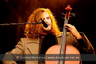 A bunch of guys dressed in garments from the end of the 18th century and equipped with classical instruments such as cello, piano, contrabass and kettledrum? A lot of ornaments onstage? Okay, that must be COPPELIUS from Berlin! This name also awaited me in big letters on the backdrop hanging at the main stage, together with the rain that was getting heavier again. ‘Habgier’ (‘Greed’) was on the agenda. Which means: Metal with classical equipment, whereas the clarinets in particular gave the whole thing a certain Yiddish touch. ‘Coppelius hilft!’ (‘Coppelius helps!’) was the promise that the guys then made before they admitted to be ‘Diener 5er Herren’ (‘Servant of 5 Gentlemen’). With ‘I Get Used To It’, the classy time travellers made a lightning quick start and just rocked out as hell. One actually can't deny that COPPELIUS also draw influences from IRON MAIDEN. A comparatively calm farewell from the "19th century chamber core" (COPPELIUS about COPPELIUS) was accomplished with ‘Ade mein Lieb’ (‘Farewell, my dear’) which saw Max Coppella and Comte Caspar sit at the brink of the stage and close their mad trip across long gone times in their usual authentic and insane way.