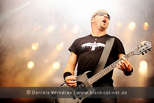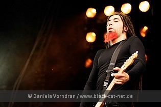 Now there was enough time for a small turn to the main stage - even though the concomitant circumstances weren't that nice: It was raining again! Somehow, though, the depressing weather really fit to END OF GREEN's gothic rock with Nordic imprint. According to their name, the guys from Stuttgart have given up hope anyways and therefore call their style "depressed subcore." Ever since 1992, the guitar-driven five-piece compliments us with its gloomy mood and knows how to transform this into music in a skilful way. All five guys, fronted by singer and guitarist Michael Huber, are complete pros, and therefore they remained in their state of melancholy, even when the sun came out in the end.