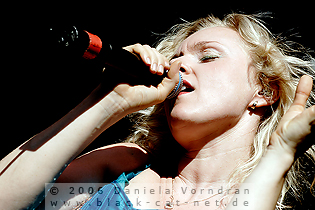 The solo work of Liv Kristine delivers not the expected metal songs but atmospheric and elegy pop songs. She takes you to her dream-world with fantastic melodies, soft ballads and fresh pop hits. Highlight of her first album ‘Deus ex Machina’ was the duet ‘3am’ with Nick Holmes of ‘Paradise Lost’. This song was played also during her set at “Bochum Total”. Duet partner was bass guitarist Timon Birkhofer. Also the title song of the debut album caused excitement within the audience. The songs of the recent album wear the signature of a personal pop-sound with Goth-Rock tunes and some folk arrangements. Ballads and up-tempo songs alternate. Especially the single ‘Fake a smile’ or the wonderful Bruce Springsteen cover version of ‘Streets of Philadelphia’ were favourites of the people in front of stage during the early Sunday evening. The opener of her set ‘Over the moon’ started with heavy guitars – but they faded soon and a drifting pop-song with a catchy hookline was unveiled. Over all the music stands Liv’s tender voice which was in best condition during the show.