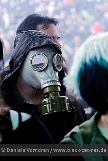 Without a doubt this isn't a rock show. The sheer amount of props give the whole scene something theatrical. A little bit of musical and a large chunk of vaudeville show presented by a vampire. I could say the BLUTENGEL show is detached from the world, but then again, it seems like BLUTENGEL fans go wherever that is. And close to the end of the show, I felt like my mind could comprehend and follow the mind of that guy with the Russian gas mask that stood in front of me. The beer I stole helped. Unfortunately Chris Pohl broke the spell himself by asking whether Gelsenkirchen is a real City or rather a village or part of a Landkreis. Chris Pohl. If you are reading this, through your contact lenses: Gelsenkirchen is a city of 250,000+ people. Once the city of a thousand fires. Dammit, this should be a fucking song title for your band! You ruined the show for me even though it was the first BLUTENGEL show I managed to enjoy. What is wrong with you? Couldn't you just talk about black tears or something? Or even black suns, if you really must?