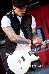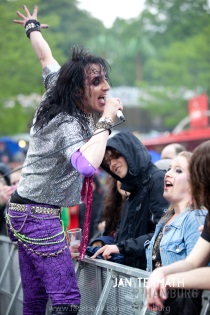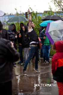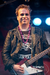 A few minutes later, SUIZIDE QUEENZ were ready to play some songs. The crowd was still a very little heap, and so Eve Elektrique (vocals and guitars) had the idea to do some stage diving. The only good thing on the weather change was that the storm was gone and now it only rained for a bit. But with the time and ongoing day, more and more people joined the terrain to watch the show. SUIZIDE QUEENZ are also a young band from Hamburg. Next to Eve Elektrique, Andy Unemployed (guitar / vocal), Alex the Face (bass) and Sascha (drums) made a crazy show with own songs. The band itself describes their music as a mix of 80s glam rock and 90s street punk rock flooded with catchy melodies and sing-along vocals. And the sing-along vocals were well received, the crowd sang along despite rain and cold temperatures. Because of the own written songs, most people of the audience must been also fans of SUIZIDE QUEENZ, for the rest the band was mostly unknown.