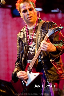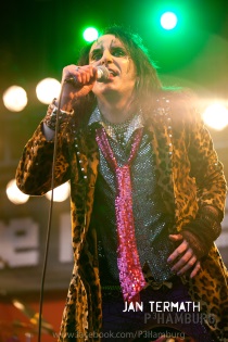 The "revolution of glam rock" was on the bill now. THE PLEASURES, another band also from Hamburg, had a package full of songs from ALICE COOPER, GUNS'N'ROSES and own ones with them. Singer Dancette Pleasure also looked like ALICE COOPER himself. He often changed his outfits, always in the glam rock style and mostly well known to fans of that genre. But the other band members also had chosen the right clothes for the gig. Sensai Pleasure (bass), Curtis Cheiron Pleasure (guitars) and Taranaki Pleasure (drums) looked all like they came right out of the 70s. The extravagant make-up of the guys finished the looks. Straitjacket and bones, tiger pattern coats and gigantic wing capes, all that equipment came to use during the show. THE PLEASURES were totally in their element and it really was a pleasure to watch them kidnapping the audience to some decades ago.