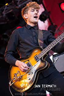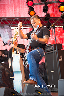 Coming from the Baltic Sea, THE COAST GUARDS from Kiel started on this day with Rockabilly sounds. Five guys, even with original double bass as it should be for a real Rockabilly band, singer Gunnar Heinze, Tommy Kosack at the drums, Marc Walter and Adrian Ernst as acoustic guitarists and Dennis Büchler with the double bass, had a lot of own and cover songs, which are all in the style of the 50s. So you could listened to well-known songs like ‘Tainted Love’ and ‘Passenger’ in a completely now sound. They had a lot of audience in front of the stage, but not many of their fans, that is why they said backstage it is always difficult when no one knows their own songs. Nonetheless, through the covers the people had a reason to stay and to watch the show of this young band, which only exists for two years now.