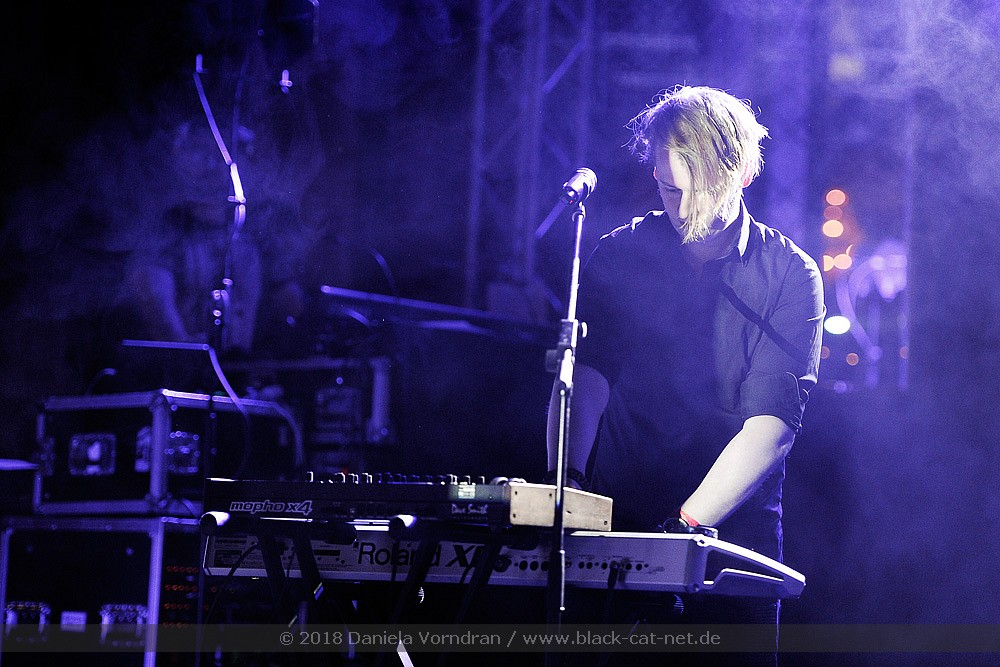 ALPHAMAY, originating from Osnabrück in Germany, was founded in 2012. Their first album was released in 2014. The two musicians are also members of the band ROZENCRANTZ. The location became more and more crowded as ALPHAMAY began their concert. In addition to older pieces, the band also presented quite new songs from their album ‘The Mellow Collie’, which was released shortly before the Wave Gotik Treffen. Really nice Electro Pop, which animated the audience to dance. There was a moment of shock when singer Henning slipped one leg into the gap between the stage and the loudspeaker. Luckily, he recovered quickly. During the beautiful cover version of, ‘On The Other Side’ everyone was dancing and singing loudly together. A great performance that will be remembered. // http://www.alphamay.de / https://www.facebook.com/electronicavantgarde // Setlist: 01. Intro / 02. The God Games / 03. Missing Me / 04. Serenity / 05. Decay Of A Dream / 06. Black Parasite / 07. On The Other Side / 08. Flat Earth Flat Head / 09. Low In Love / 10. C = 64 / 11. The Carousel / 12. Don’t Go