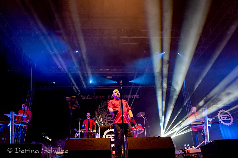 Next band on stage was SOLITARY EXPERIMENTS. During the whole day and especially before the show, the band handed out little paper flags to the audience, so that the people could always wave them during the show. The German Electro band from Frankfurt /Oder was already founded back in 1994 by Michael Thielemann and Dennis Schober. Almost twenty years after the inception of SOLITARY EXPERIMENTS the album ‘Phenomena’ managed to enter the German charts and their popularity boosted furthermore since then. Besides Dennis and Michael, the line-up of the band is completed by Markus Schmidt on keys and during their live shows by Frank Glaßl and Sebastian Gauff on drums and percussions. All are wearing the trade-mark red shirts with black ties. The audience in the Agra was celebrating the Synth Pop they got served by the five-piece and of course people were waving their little paper flags. Solid performance! // http://www.solitaryexperiments.de / https://www.facebook.com/solitaryexperiments // Setlist: 01. Trial and Error / 02. Immortal / 03. Pale Candle Light / 04. I am / 05. No Salvation / 06. Delight / 07. Crash and Burn / 08. Point of View / 09. Rise and Fall / 10. Epiphany / 11. Stars