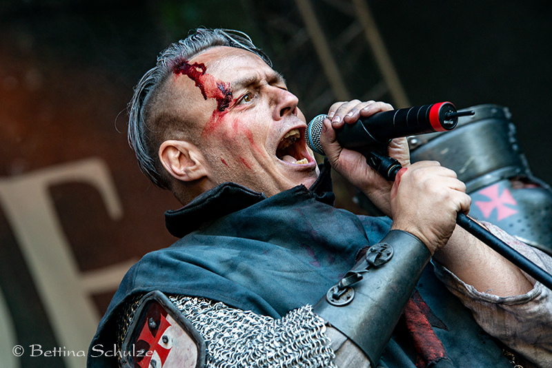 From the Agra hall, we then ran across the campground to the Pagan Village, where HEIMATAERDE were expected to appear soon. Already smeared with blood, they came on the stage and put on a great show. HEIMATAERDE combines danceable, electronic beats with archaic orchestrated melodies. Medieval Electro or Medieval Electro Rock were the terms that the music press coined for the project in 2006, and since then HEIMATAERDE has taken no break in further developing their punchy sound mix of EBM, NDH and Medieval music. Their shows are always marked by martial medieval scenes and lots of blood. And so, the show at WGT was no exception. // http://www.heimataerde.de / https://www.facebook.com/HeimataerdeOffiziell