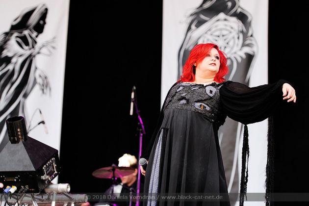 On the afternoon of the second festival day, L’ÂME IMMORTELLE entered the main stage. In beautiful summer weather the area in front of the stage was well filled. The concert started with the opener ‘Undendlich’ from the current album ‘Hinter dem Horizon’. Three big black and white banners adorned the stage. The second song was ‘Stumme Schreie’, one of the band’s big hits. The musicians of the band were completely black-clad and thus fitted in nicely with the majority of festival visitors. Singer Sonja did not change clothes during the concert but as usual was dressed beautifully. For the next few songs Thomas took the second keyboard while Sonja sang alone. As always, they convinced with their great performance and a wonderful, emotional live version of the song ‘Fallen Angel’. The great sound let the clear voice of Sonja come into its own. By now the audience were dancing right to the back row. Then came ‘Ich fang dich auf’ - which Thomas sang alone and then thanked the fans for the applause. This was followed by two beautiful duets, especially the performance of ‘Es tut mir Leid’ which is absolutely fantastic live.