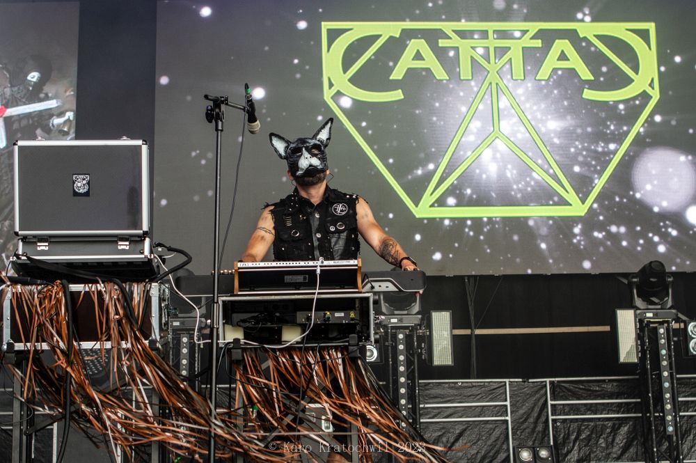 Kicking off the performances on the castle stage that day was the German duo, CATTAC, who delivered a truly devilish show, their clerical disguises contrasting with the diabolical power emanating from their vocals and music. Their incredibly energetic and dynamic sounds drew inspiration from the best sources of industrial, electro, and dark wave genres, serving as the perfect warm-up for the Sunday line-up of concerts. Helm and Chris put on an impressive show that attracted a substantial crowd of fans.