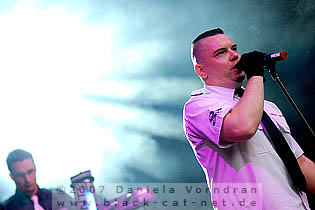 Next band on the big stage was FROZEN PLASMA, a performance I was looking forward a lot because I liked the show at last year’s Amphi Festival. Felix and Vasi, two musicians already well involved into other musical projects. Felix is member of DIORAMA where he plays keys and also started a solo project under his own name, while Vasi is known from his industrial project REAPER and his former band NAMNAMBULU that split up in summer 2005. Vasi and Felix met during the VNV NATION tour in 2005 when Vasi did live key for VNV NATION and Felix was supporting the band with DIORAMA. The idea of building up a new project - FROZEN PLASMA - was born. FROZEN PLASMA are Vasi Vallis (song writing, production, lyrics) and Felix Marc (vocals). http://www.frozenplasma.com/ / http://www.myspace.com/frozenplasma
