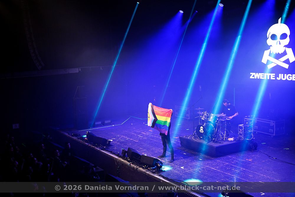 ZWEITE JUGEND call for ‘Liebe für alle’ and give expression to this demand by proudly holding up the “Inclusive Pride Flag”. The band place importance on their concerts being a safe space for everyone. Eli thanks the majority of their fans for helping to make this possible, and for over ten years of ZWEITE JUGEND, and seems almost surprised at how far things have come in that time.
