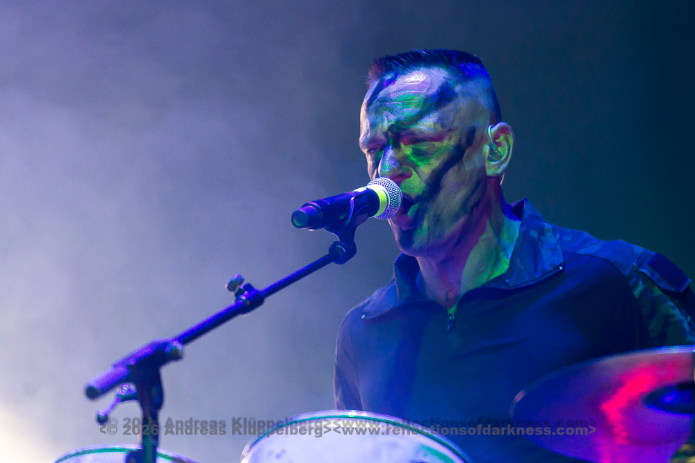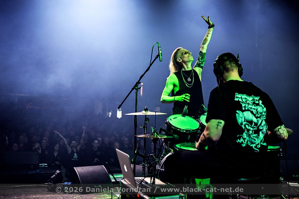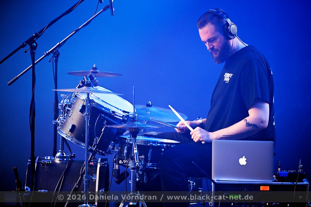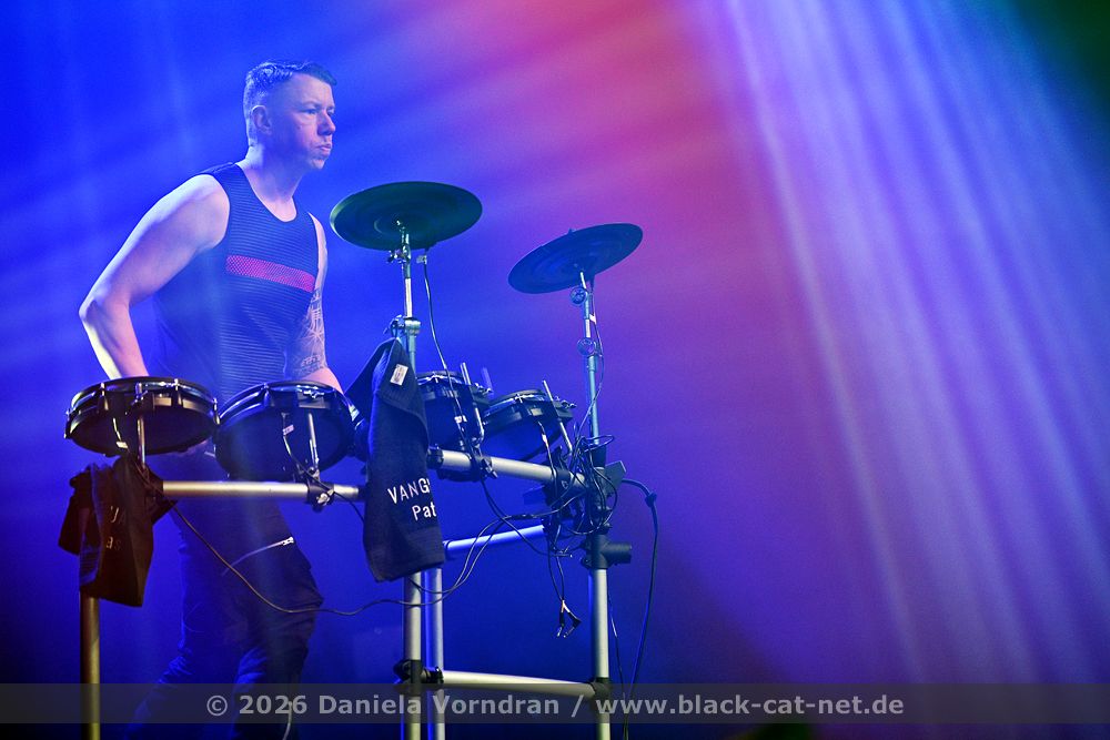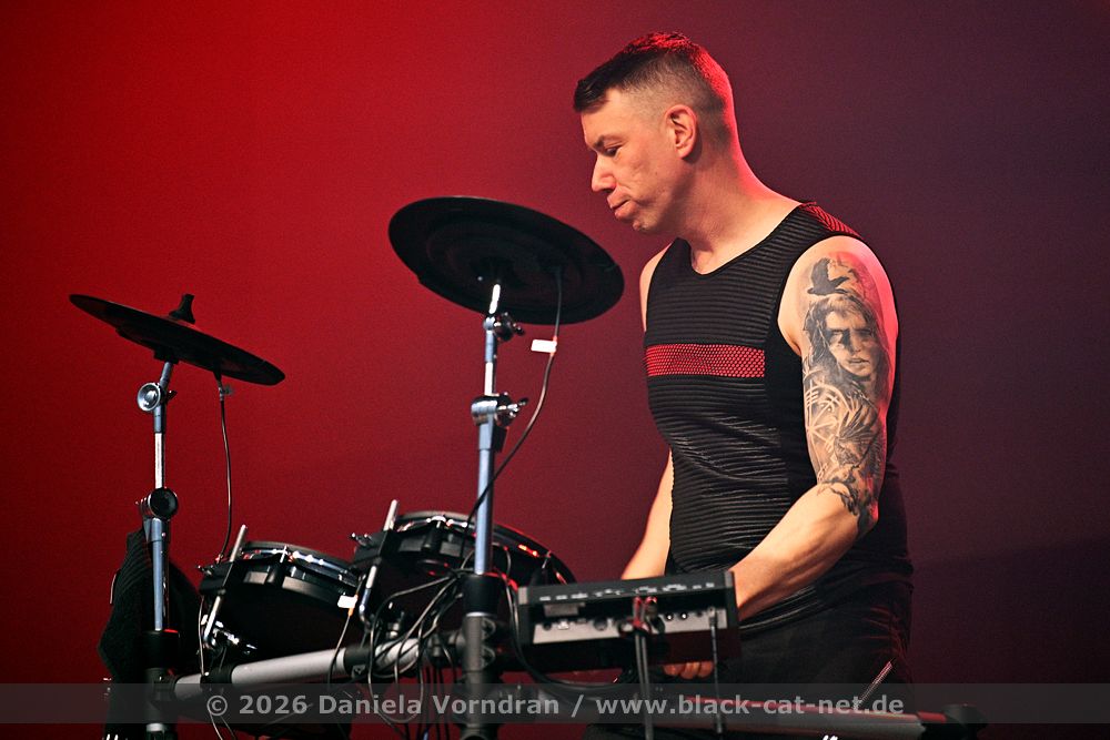 By the time we finally pull ourselves together and drag our tired limbs into the main hall, the final notes of ‘Memento Mori’ are just fading away. We find a spot next to the rear bar, slightly elevated, which gives us a fairly good view of the stage. Music is the strongest form of magic - and so ‘I Am’ manages to breathe life back into my weary body once more. “Can you keep going? Was that a great E-tropolis? Let me hear you.” The pace remains high, while Waik attacks the keyboard during ‘Titânes’ reminding me of Animal from The Muppet Show on the drums. Speaking of drums - today, PROJECT PITCHFORK have brought a third drum kit. After all, the stage is big enough.