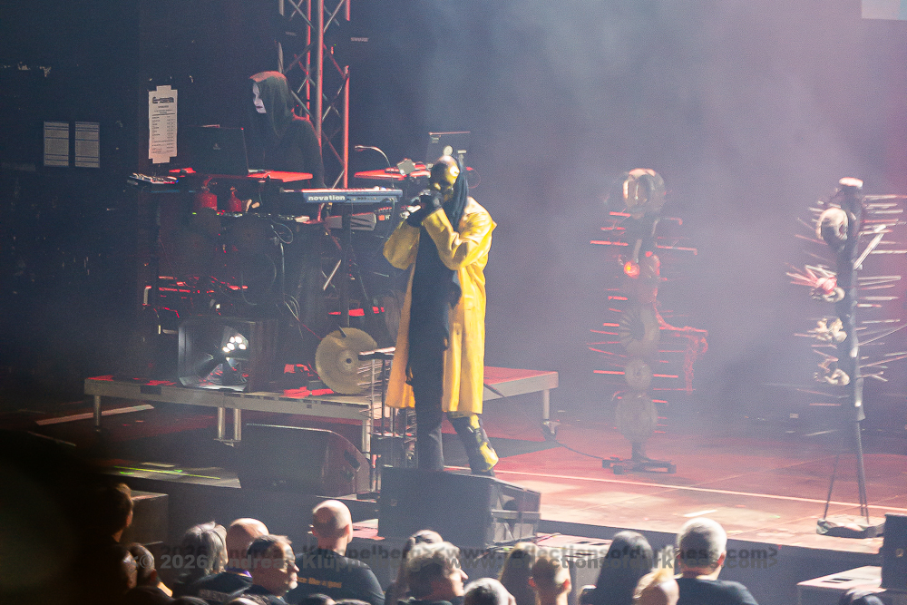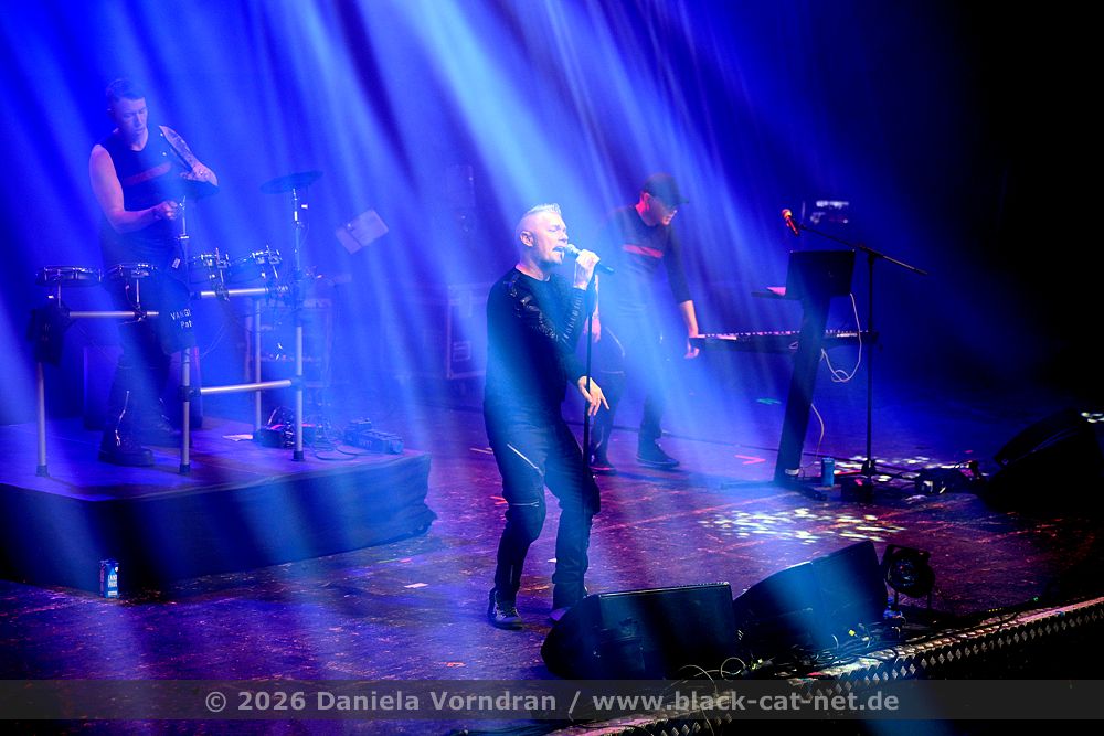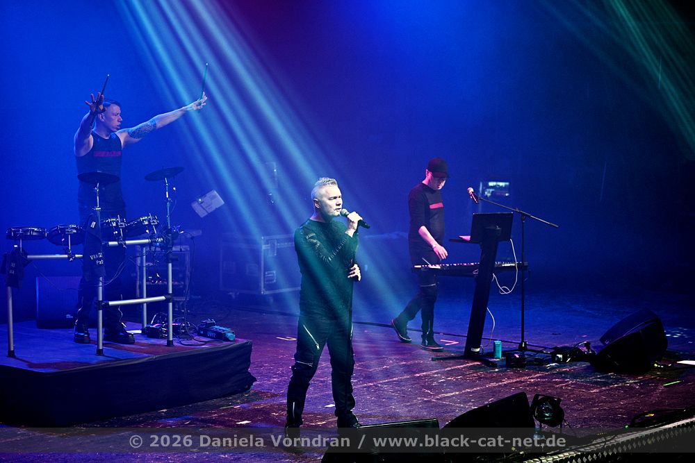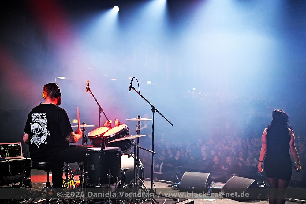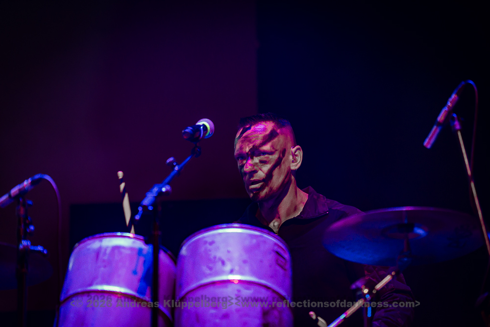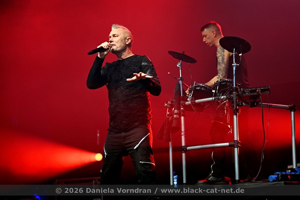 By the time we finally pull ourselves together and drag our tired limbs into the main hall, the final notes of ‘Memento Mori’ are just fading away. We find a spot next to the rear bar, slightly elevated, which gives us a fairly good view of the stage. Music is the strongest form of magic - and so ‘I Am’ manages to breathe life back into my weary body once more. “Can you keep going? Was that a great E-tropolis? Let me hear you.” The pace remains high, while Waik attacks the keyboard during ‘Titânes’ reminding me of Animal from The Muppet Show on the drums. Speaking of drums - today, PROJECT PITCHFORK have brought a third drum kit. After all, the stage is big enough.