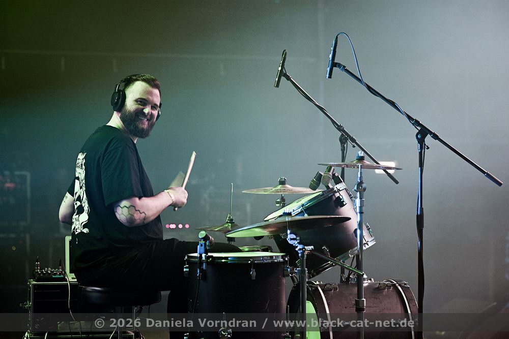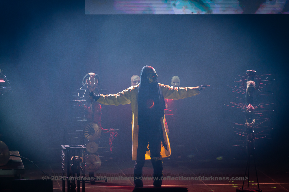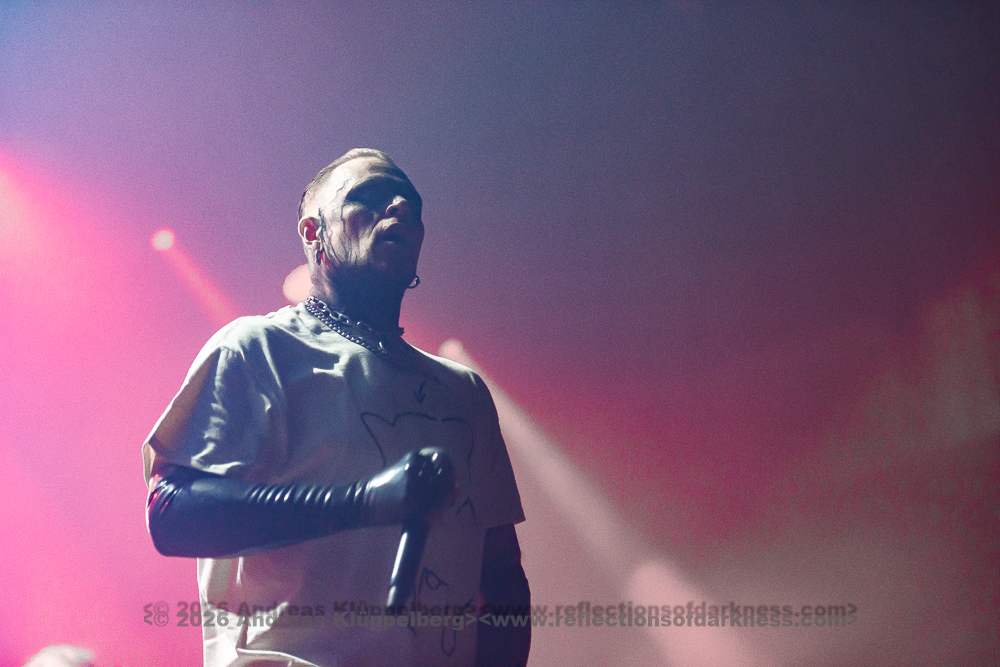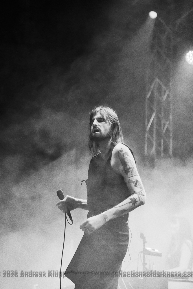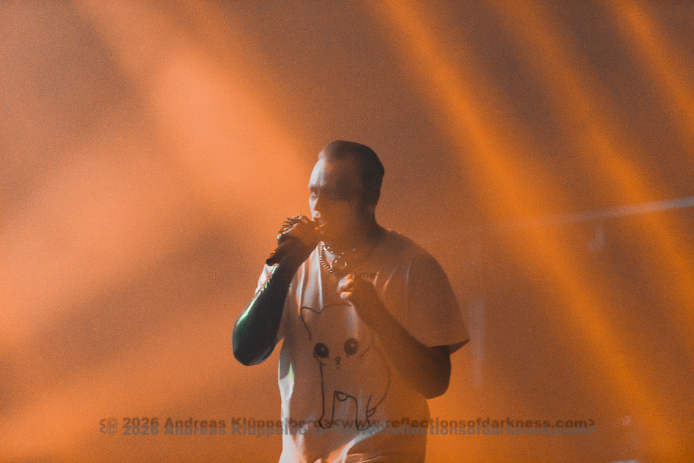 Around the middle of the set, we manage to move a bit further towards the centre. From here, I have a better view of the stage, and the sound is also improved. The staging is conceptually dense and consistent throughout. The performance appears deliberately reduced to body language and precise gestures, creating an almost ritualistic atmosphere. The 45-minute performance comes to an end with a short "stop!", forming a coherent fusion of performance, visual symbolism, and complex sound structures into a remarkable highlight of this festival day. // Setlist: 01. New Eden / 02. Flatline Friend / 03. pROGNOSIs / 04. Baptism of Fire / 05. The Needle / 06. uNKNOWn tO vIRTUe / 07. Tyrants