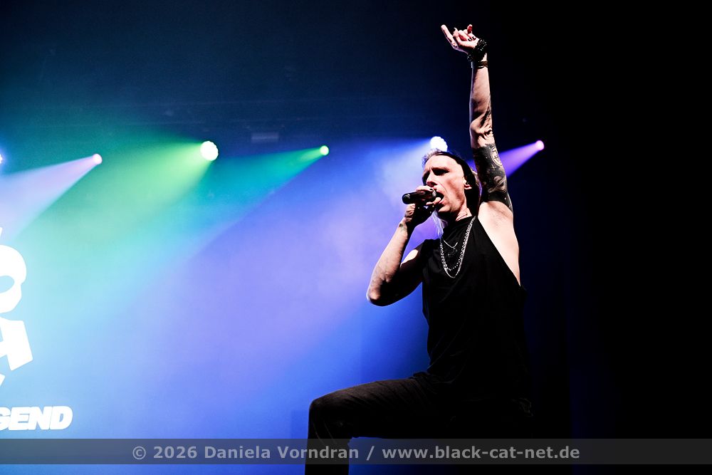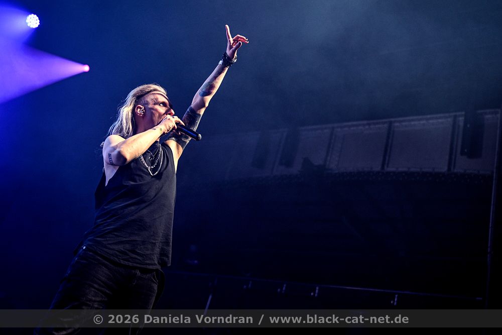“Thank you. But enough with the sentimental stuff. Now it’s time to get rough again. I need to see all hands in the air. There’s no other way.” Hands shoot up. ‘Bomb’ makes the energy explode. Sascha counts down - “I’m warning you! More hands!” He practically challenges the audience, and they willingly rise to it. It is time for a synthesiser solo - “Ladies and Gentlemen, Mr Henning Verlage.” The atmosphere intensifies. The audience chants “Don’t wake me up, don’t wake me up” and delivers more than just a decent chorus. Every line of the songs is sung along loudly - “We all share the scars, we all won’t belong / We carry the weight and need to be strong”.