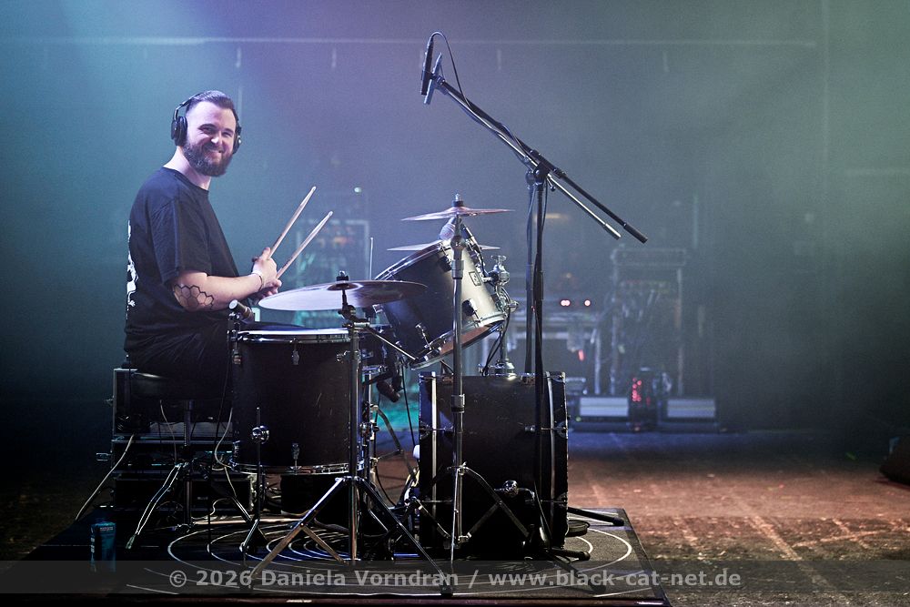 Turbinenhalle 2 is starting to empty out, and we also consider whether to head over for a short detour to FUNKER VOGT and FADERHEAD. But for one thing, it is already packed to the brim over there. For another, I could really use a short breather during the changeover. Besides, I do not want to give up my spot in the front row, because at the latest for NEUROTICFISH and KITE, I want to be standing right here. That also rules out a visit to the merch area in Turbinenhalle 3, and the culinary offerings remain unexplored for now. It is twenty to six. I am as tired as if it were eleven. The far too short night is making itself felt. But we’ll hold our ground - so, NOISUF-X it is.