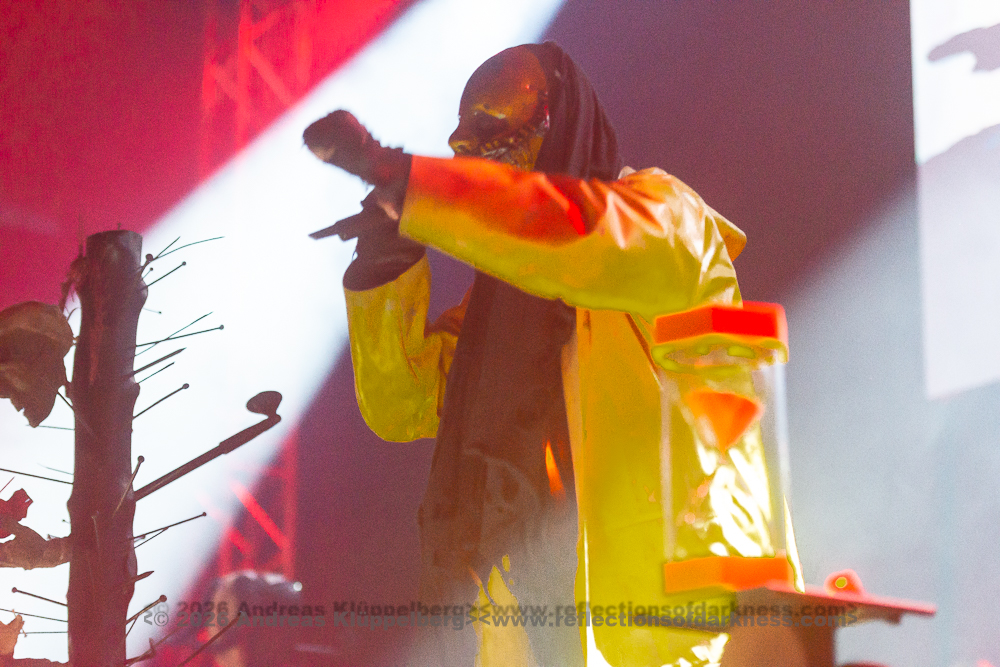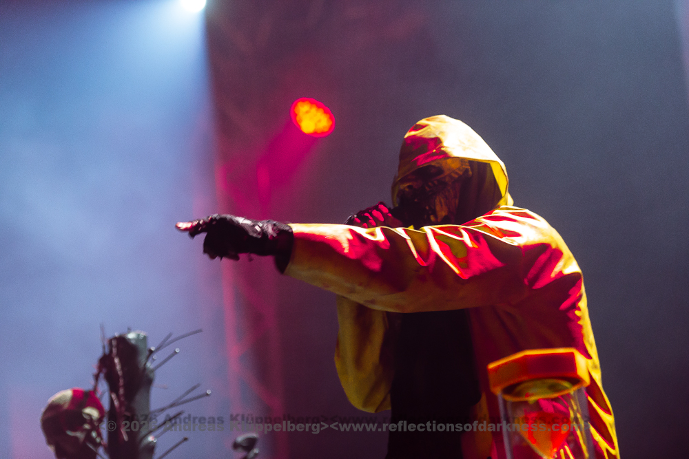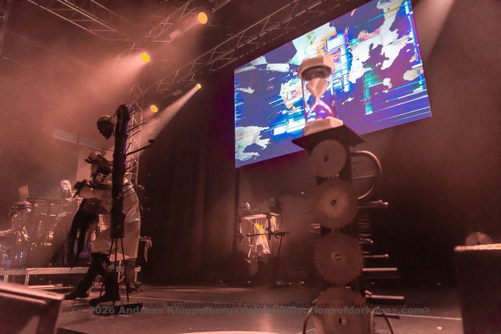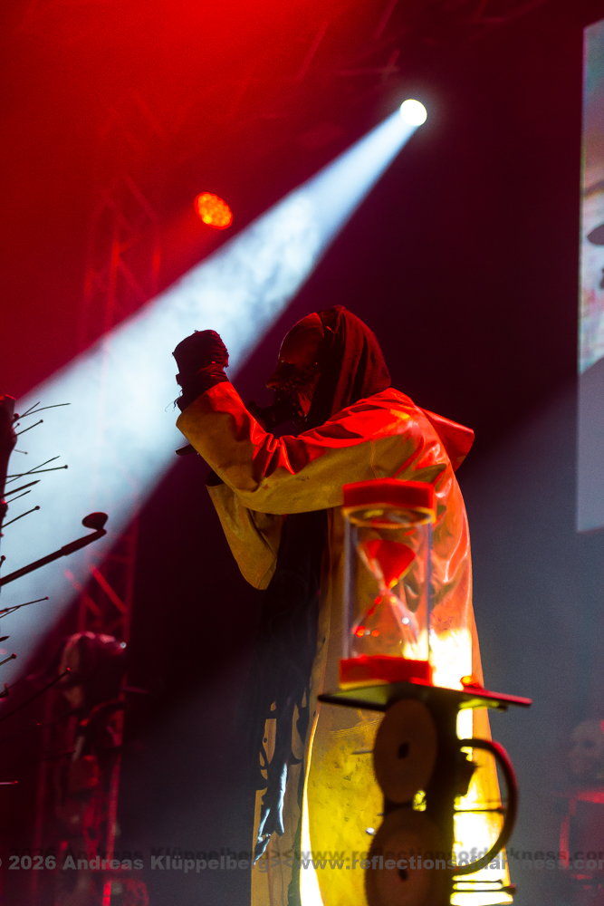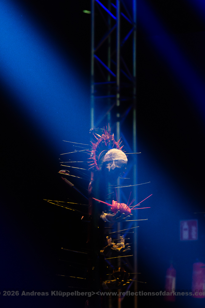 Today’s performance is almost something of a closing concert for their “Lessons in Humility Tour”, and as the band wrote in advance on their Facebook page, all these props are being brought onto the stage one last time. The stage setting is truly impressive. It is dominated at the front by an hourglass as a symbol of time and transience. Various props are distributed across the stage, which, over the course of the show, reveal themselves as a coherent visual structure, each finding its place within the staging. Everything is covered in sharp spikes and thorn-like structures, creating an almost dystopian impression.