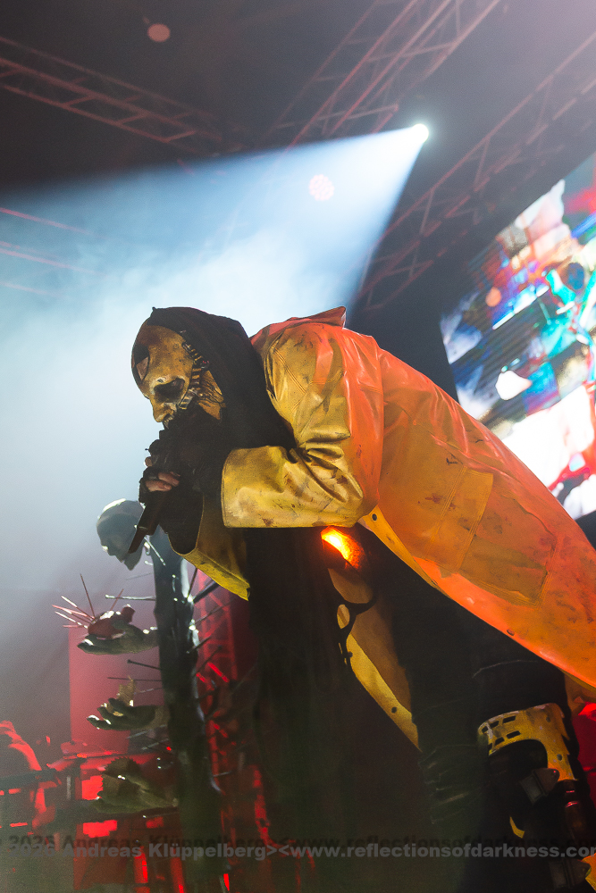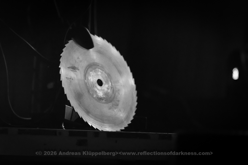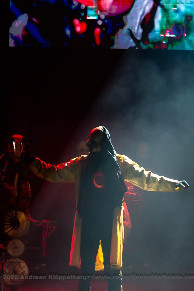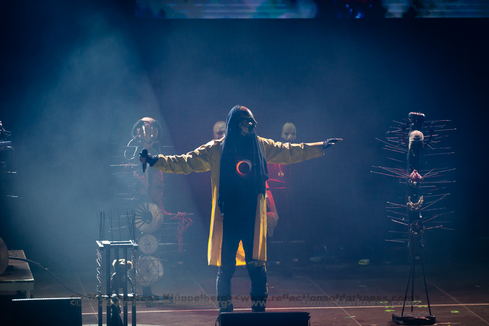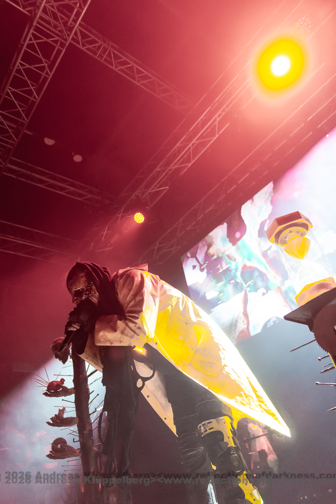 Today’s performance is almost something of a closing concert for their “Lessons in Humility Tour”, and as the band wrote in advance on their Facebook page, all these props are being brought onto the stage one last time. The stage setting is truly impressive. It is dominated at the front by an hourglass as a symbol of time and transience. Various props are distributed across the stage, which, over the course of the show, reveal themselves as a coherent visual structure, each finding its place within the staging. Everything is covered in sharp spikes and thorn-like structures, creating an almost dystopian impression.
